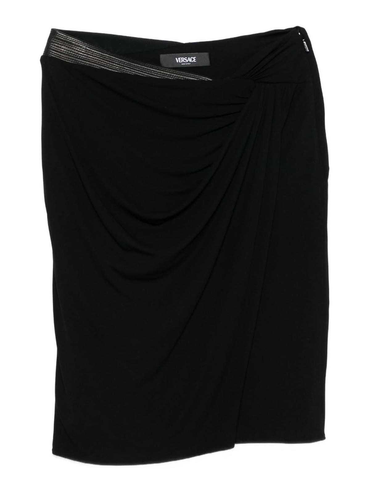 Jupe drapée Versace confectionnée en noir, le design asymétrique ajoute une touche audacieuse et sophistiquée. Jupe drapée Versace, ourlet asymétrique drapé noir