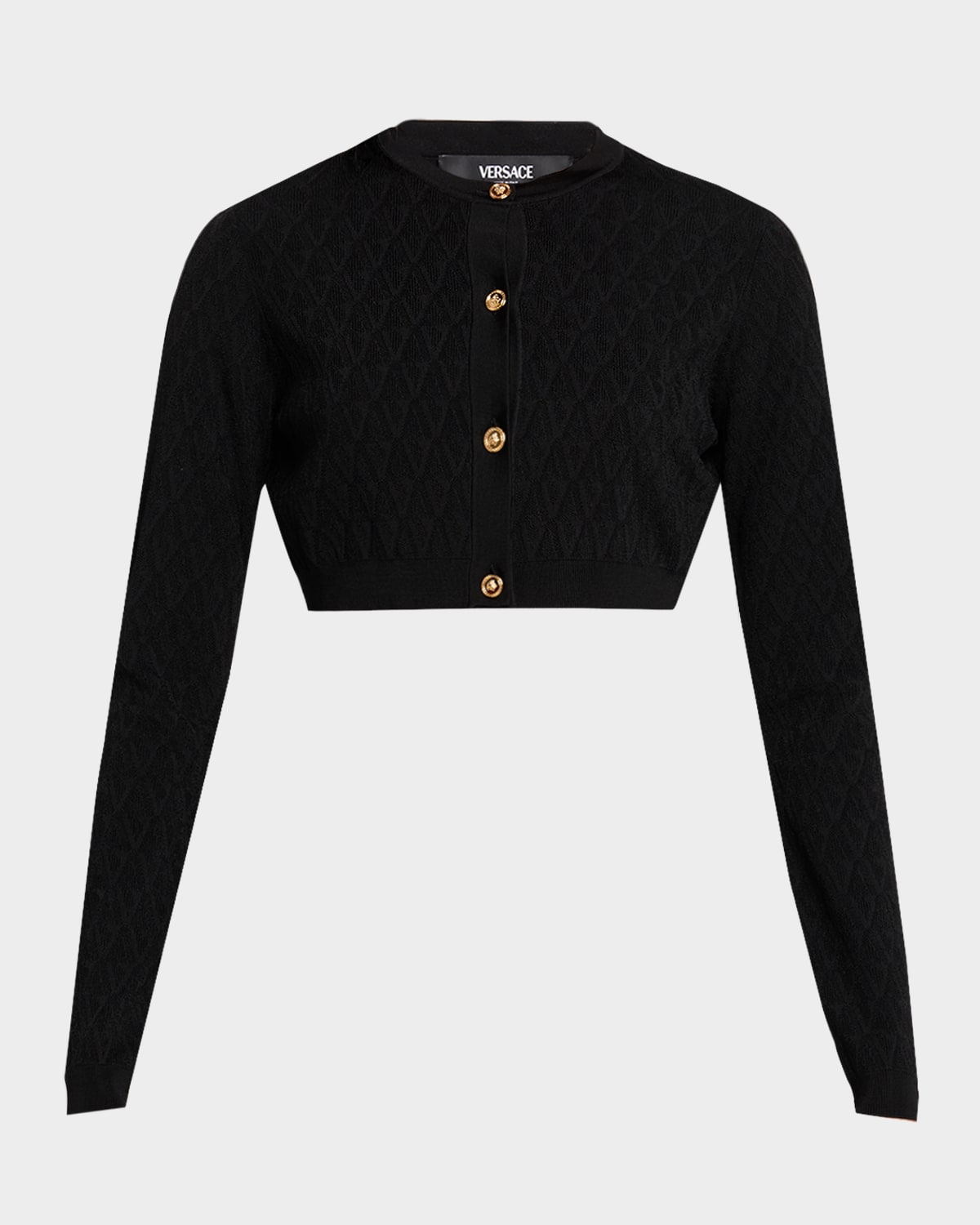 Featuring a tonal knit jacquard V allover pattern, this cropped cardigan by Versace is adorned with signature goldtone Medusa buttons for a touch of glamour. Crew neckline Long sleeves Cropped fit Buttonfront Viscose/nylon/polyamide/elastane Dry clean Made in Italy