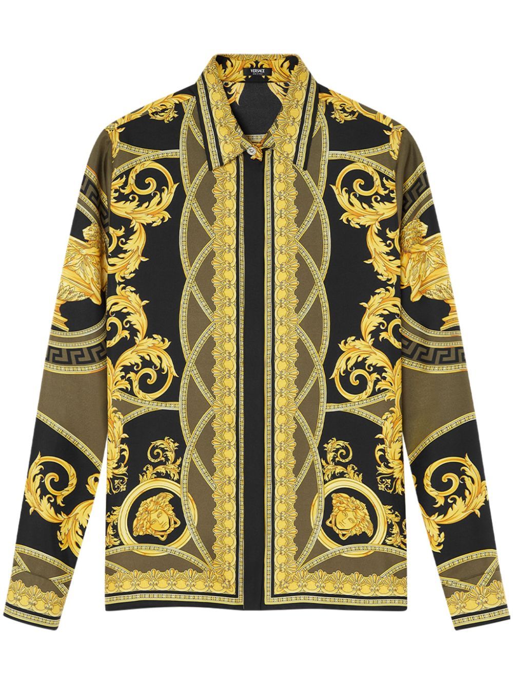 yellow/multicolour silk twill weave all-over graphic print Medusa Head motif pointed flat collar long sleeves concealed front button fastening buttoned cuffs straight hem