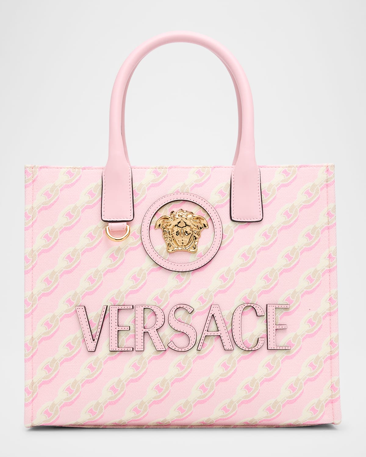 Versace "La Medusa" chain printed canvas tote bag with signature Medusa head accent Rolled top handles Detachable, adjustable crossbody strap Can be worn as a top handle or crossbody bag Open top with snap strap closure Interior, one zip pocket Approx. 9.5"H x 11.6"W x 5.7"D Cotton Made in Italy