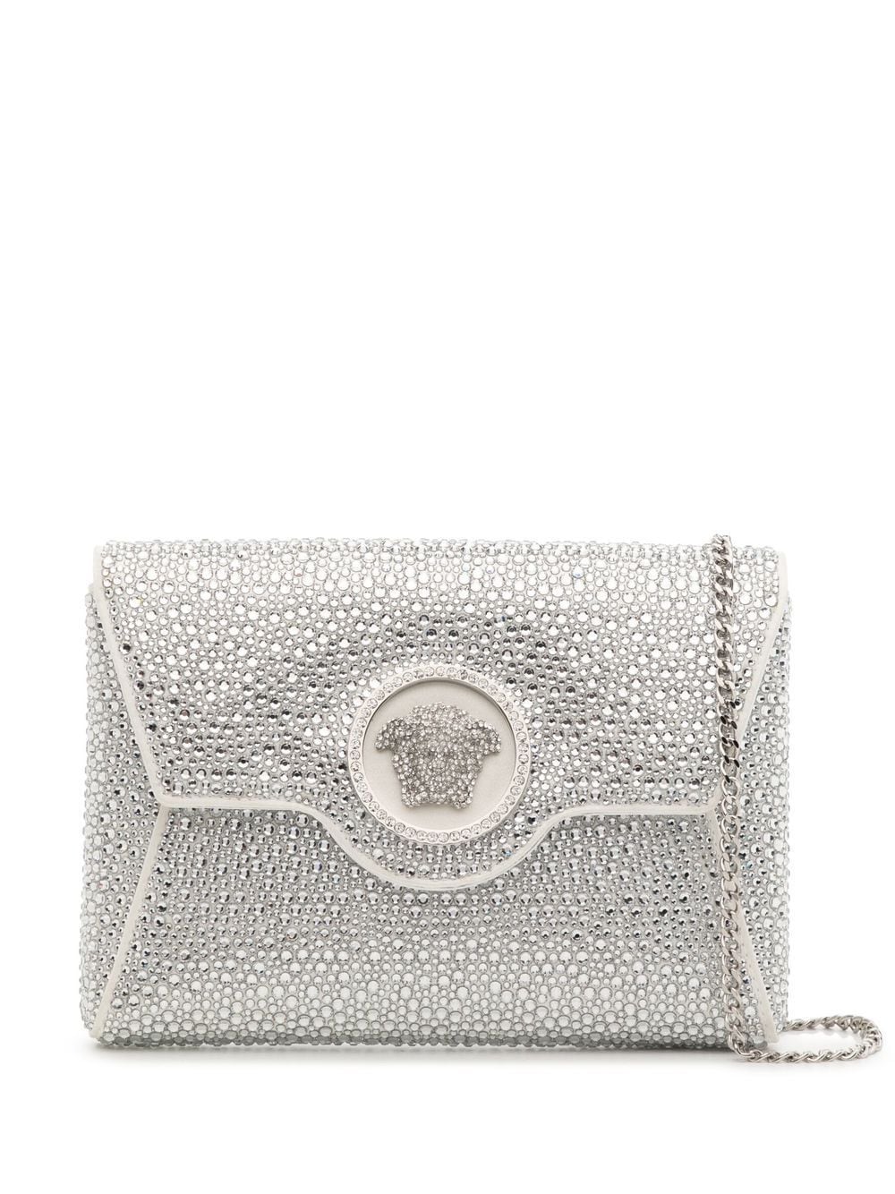 silver leather crystal embellishment Medusa plaque detail foldover top with magnetic fastening detachable chain-link shoulder strap