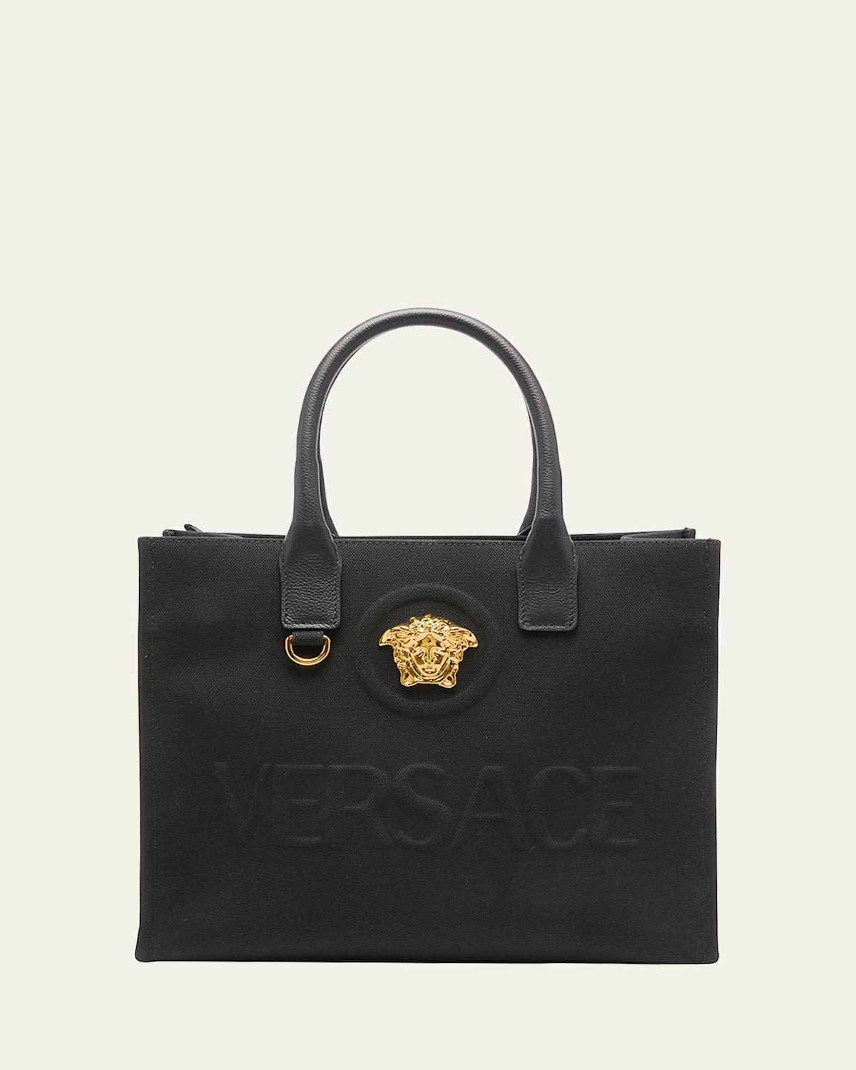Versace "Le Medusa" cotton and calf leather tote bag with embossed logo across front Features Medusa head medallion Rolled top handles Detachable, adjustable shoulder strap Can be worn as a top handle or shoulder bag Open top with snap closure Interior, one zip pocket Leather feet protect bottom of bag Approx. 9.4"H x 11.6"W x 5.7"D Made in Italy