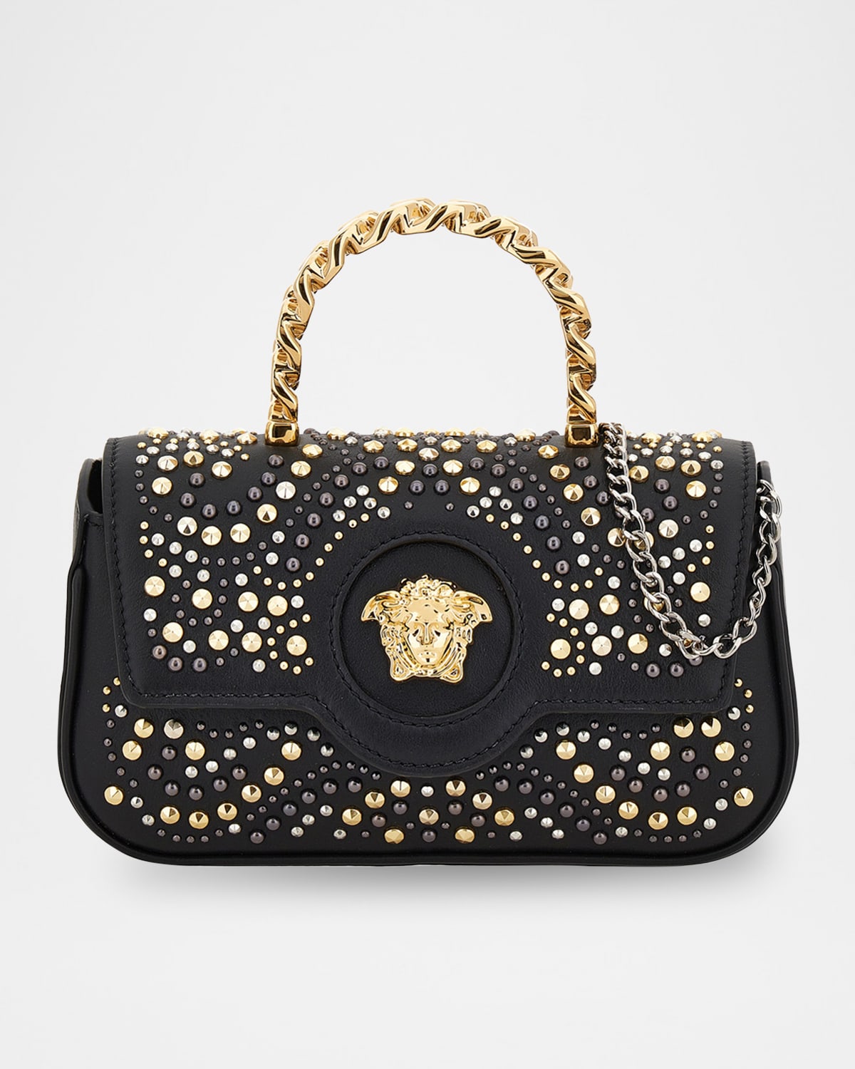 Versace "La Medusa" mini top handle bag glitters all over with swirling studs Features signature Medusa head accent Twisted metal top handle Detachable chain shoulder strap Can be worn as a top handle or shoulder bag Flap top with magnetic closure Interior, one slip pocket Lining: Leather Approx. 4.7"H x 7.5"W x 2"D Made in Italy