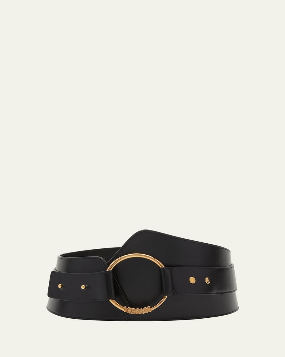 Versace asymmetrical waist belt in leather Adjustable fit Circle buckle; logo accent Tonal stitching Professional cleaning recommended Made in Italy