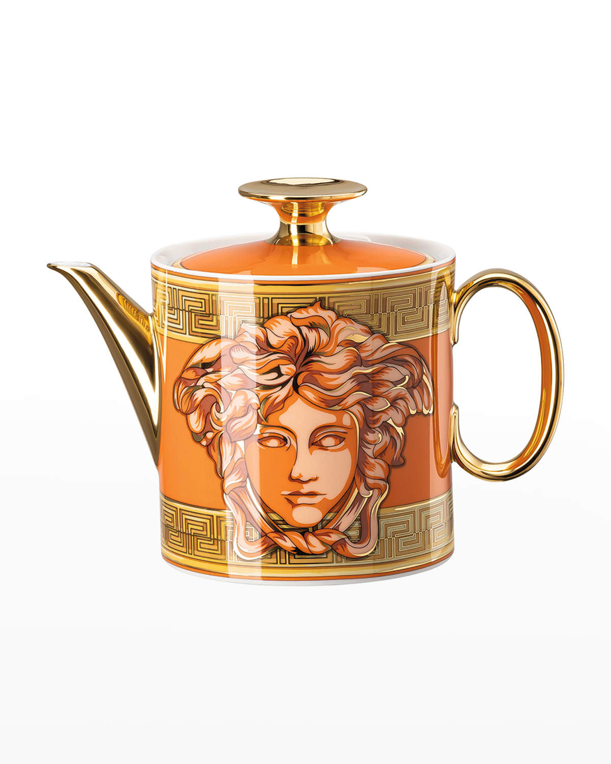 Versace pays tribute to the house's institutional Medusa, reimagined and amplified in fresh pastel colors The iconic head is imposingly emblazoned, framed by a classic meander band in gold. Made of porcelain Approx. 5.66"T Item weight (Lbs.): 1.4 Dishwasher safe Made in Germany