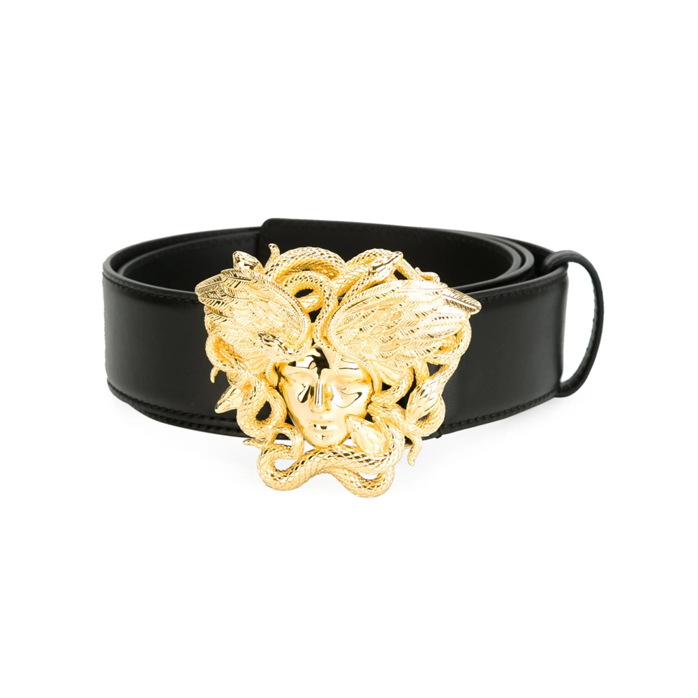Black calf leather Medusa belt from Versace featuring gold-tone hardware and an adjustable fit.