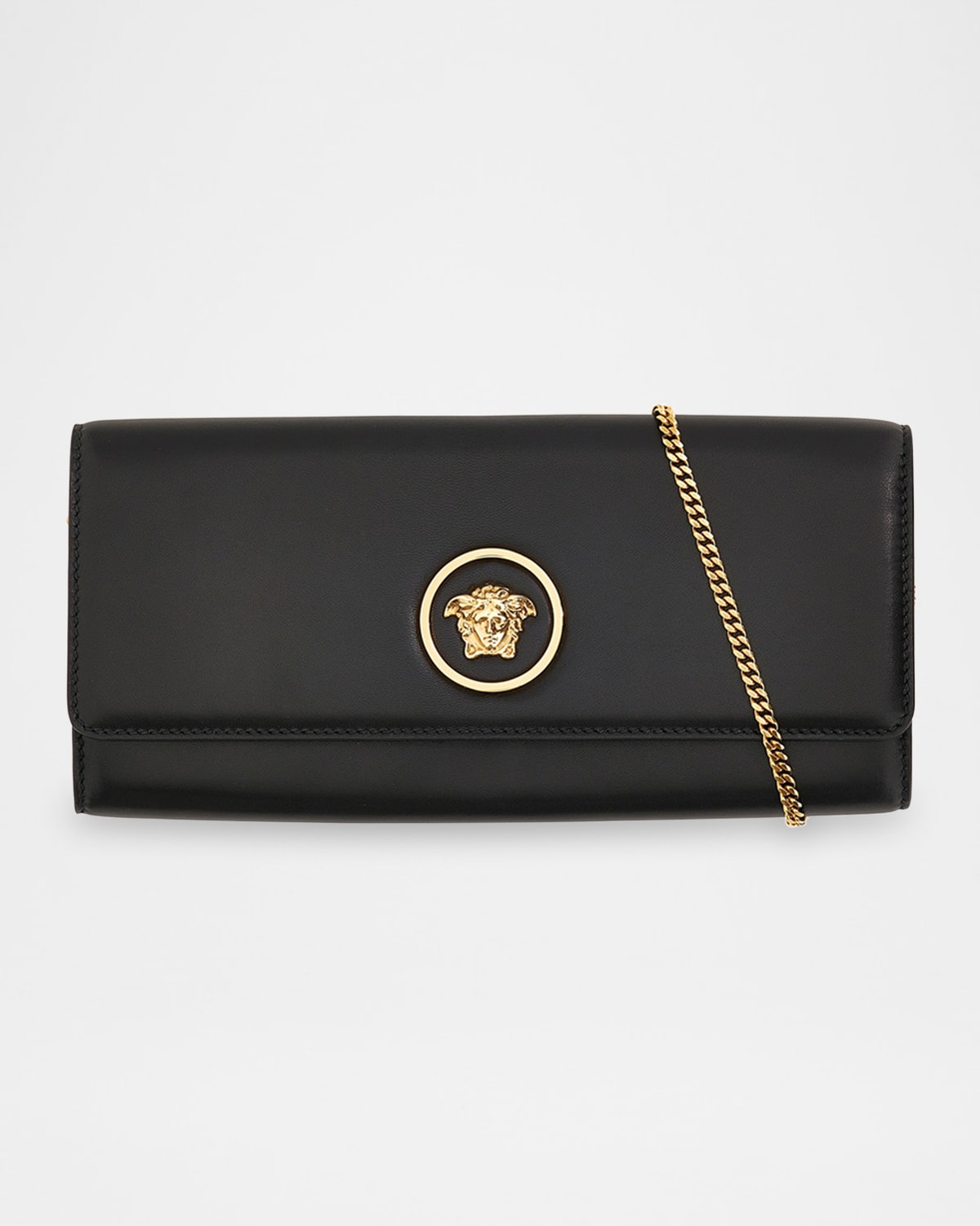 A minimalistic design in smooth lambskin leather, this Versace clutch bag is accented with the signature Medusa icon on the front Chain shoulder strap Can be worn as a clutch or shoulder bag Flap top with magnetic closure Approx. 5.5"H x 11"W x 2.4"D Made in Italy