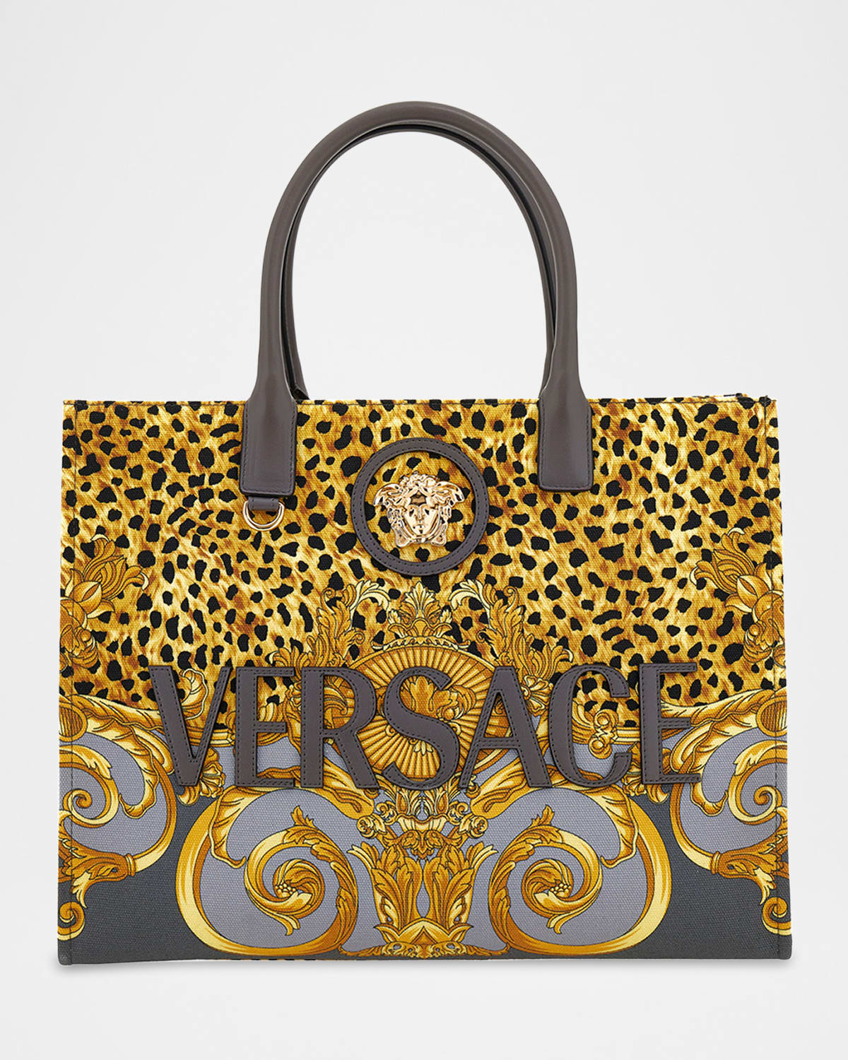 This cotton canvas Versace tote bag sports a bold and eyecatching design, blending signature barocco and animal prints with the signature Medusa icon Smooth and solid leather finishes contrast the intricate design Rolled top handles Detachable shoulder strap Can be worn as a top handle or shoulder bag Open top with snap strap closure Interior, one zip pocket Lining: Cotton Trim: Leather Approx. 11.8"H x 15.7"W x 6.3"D Made in Italy