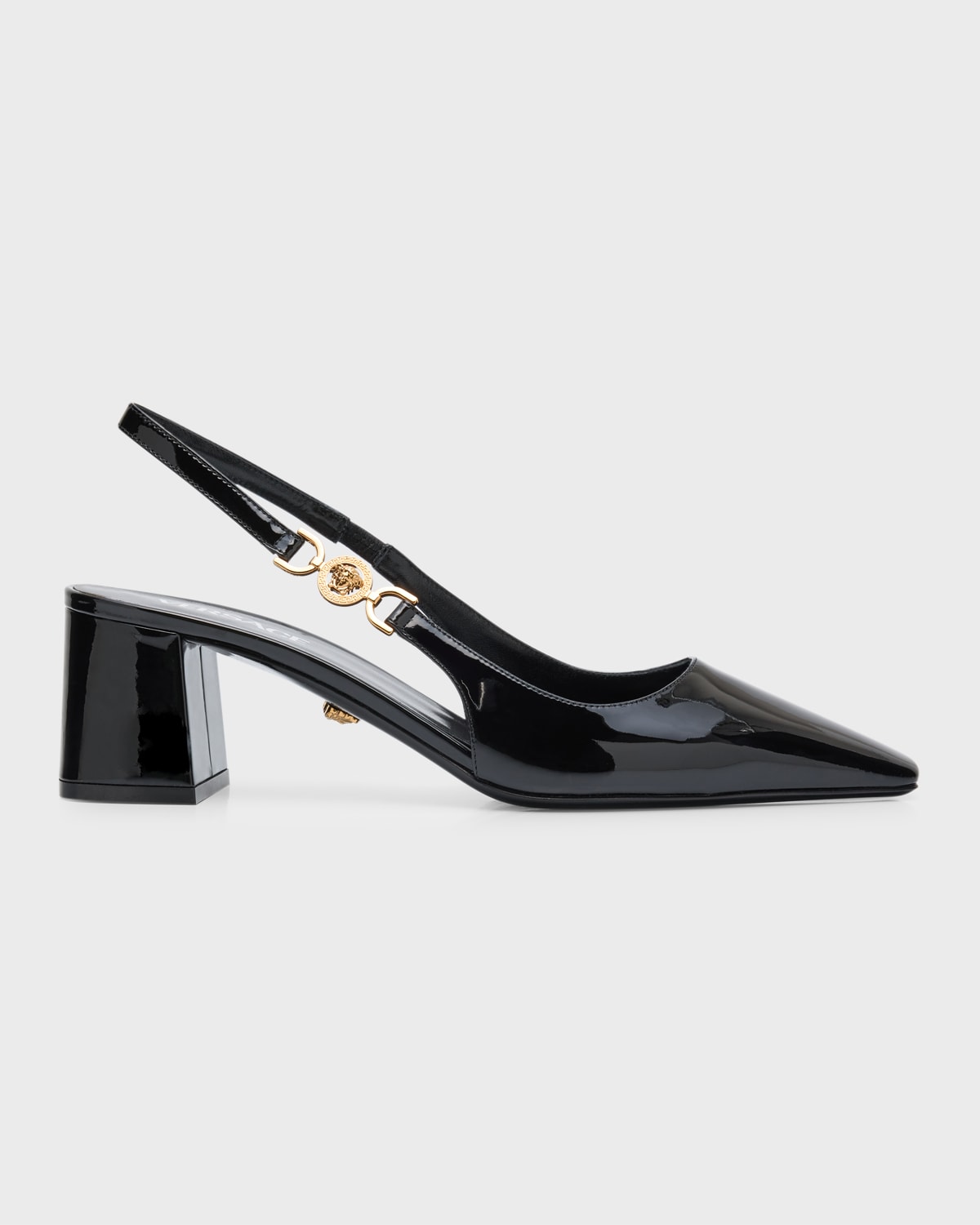 Versace patent leather pumps with golden Medusa accent 2.25 in / 55 mm block heel Square toe Stretch slingback strap Leather outsole Spot clean Made in Italy