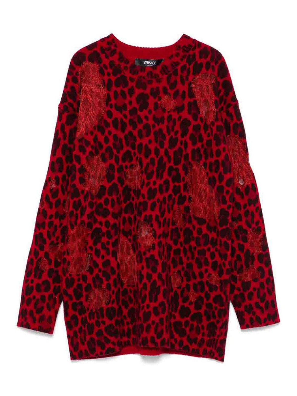 Construction en maille mélangée rouge vif, empiècements semi-transparents sur l'ensemble, imprimé léopard, col rond, épaules, manches longues, poignets et ourlet côtelés, ourlet droit
