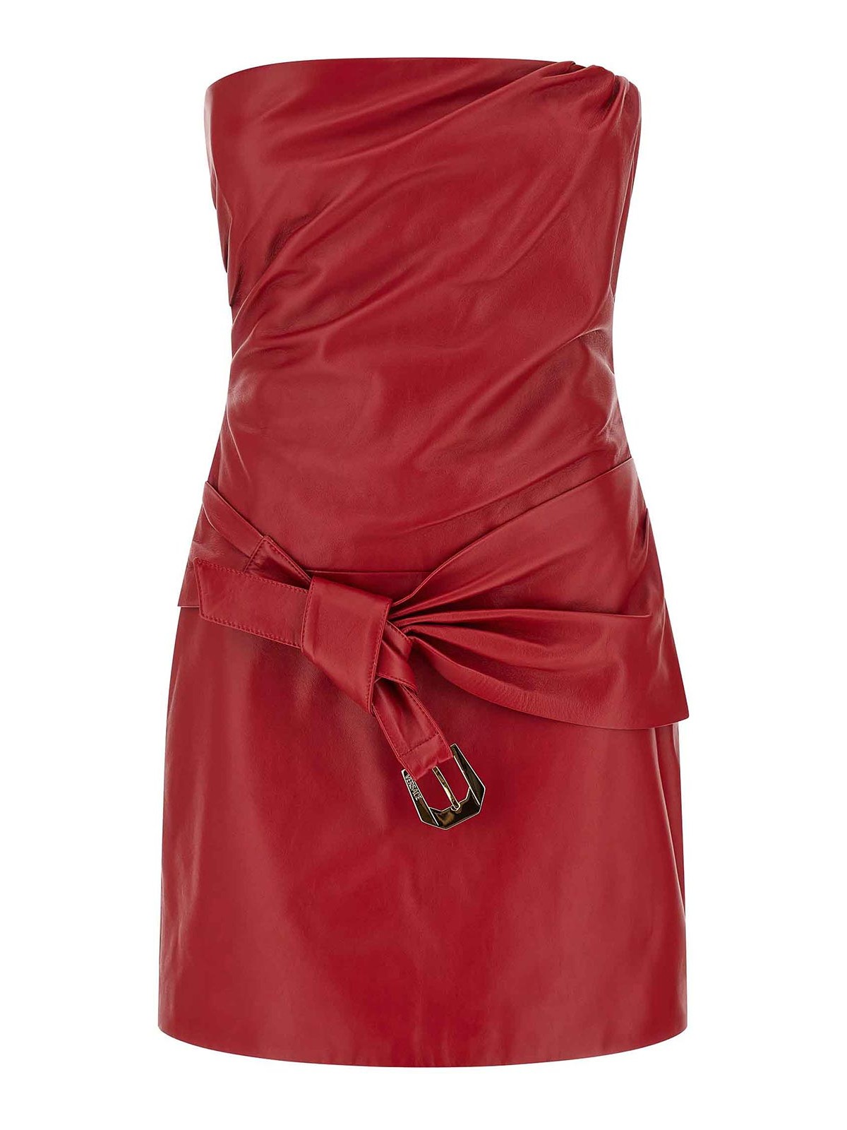 Mini-robe en nappa, détail noué et drapé avec boucle en métal « Medusa Heritage » sur le devant, modèle à épaules dénudées, sans manches, fermeture zippée au dos, doublure en cupro.