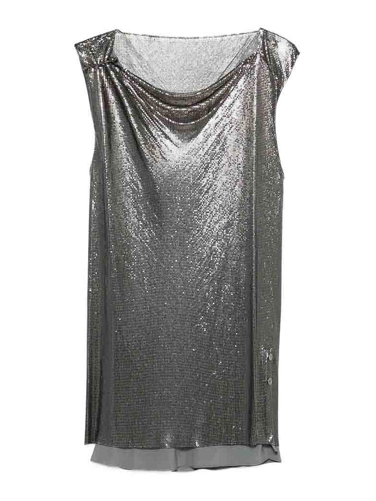 Construction en cotte de mailles légèrement ton pistolet, col bénitier, ourlet droit sans manches