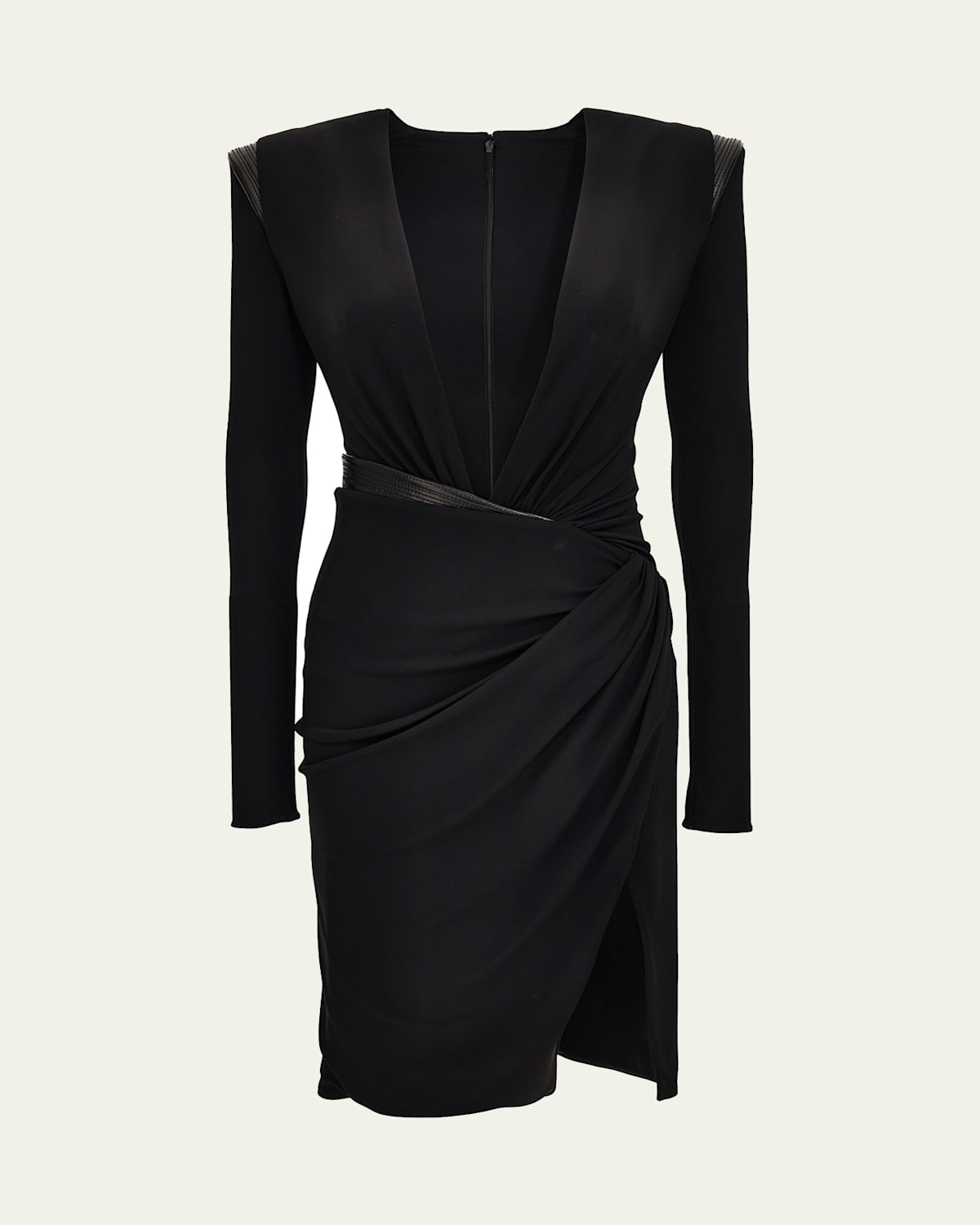 This Versace mini dress is powerfully sophisticated, finished with gathered ruching to define the figure and topstitched leather trim for added dimension Deep V neckline Padded shoulders Long sleeves Side slit hem Hem falls above the knee Bodycon silhouette Back zipper Polyester/viscose/elastane Dry clean Made in Italy