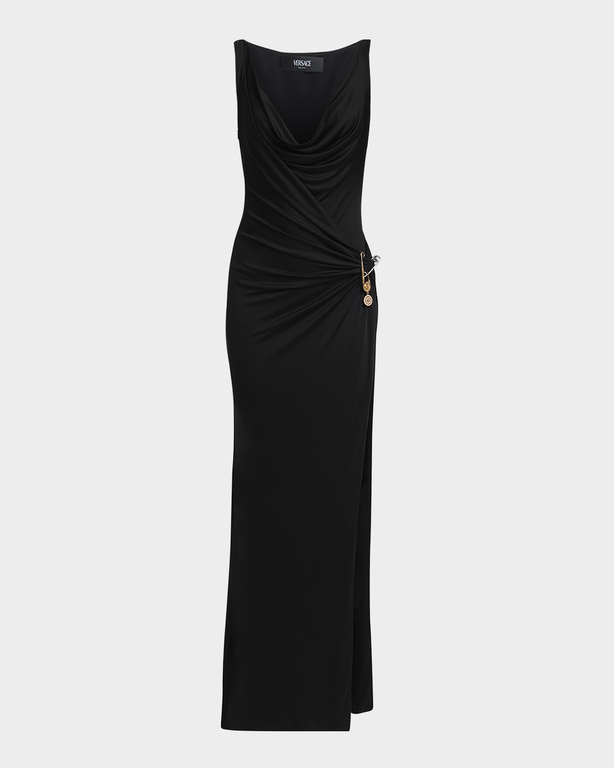 Versace responsible liquid jersey gown featuring draping and signature Medusa safety pin detail Scoop cowl neckline Sleeveless Column silhouette Full length Thighhigh side slit hem Invisible side zip Viscose Lining: Viscose Professional cleaning recommended Made in Italy