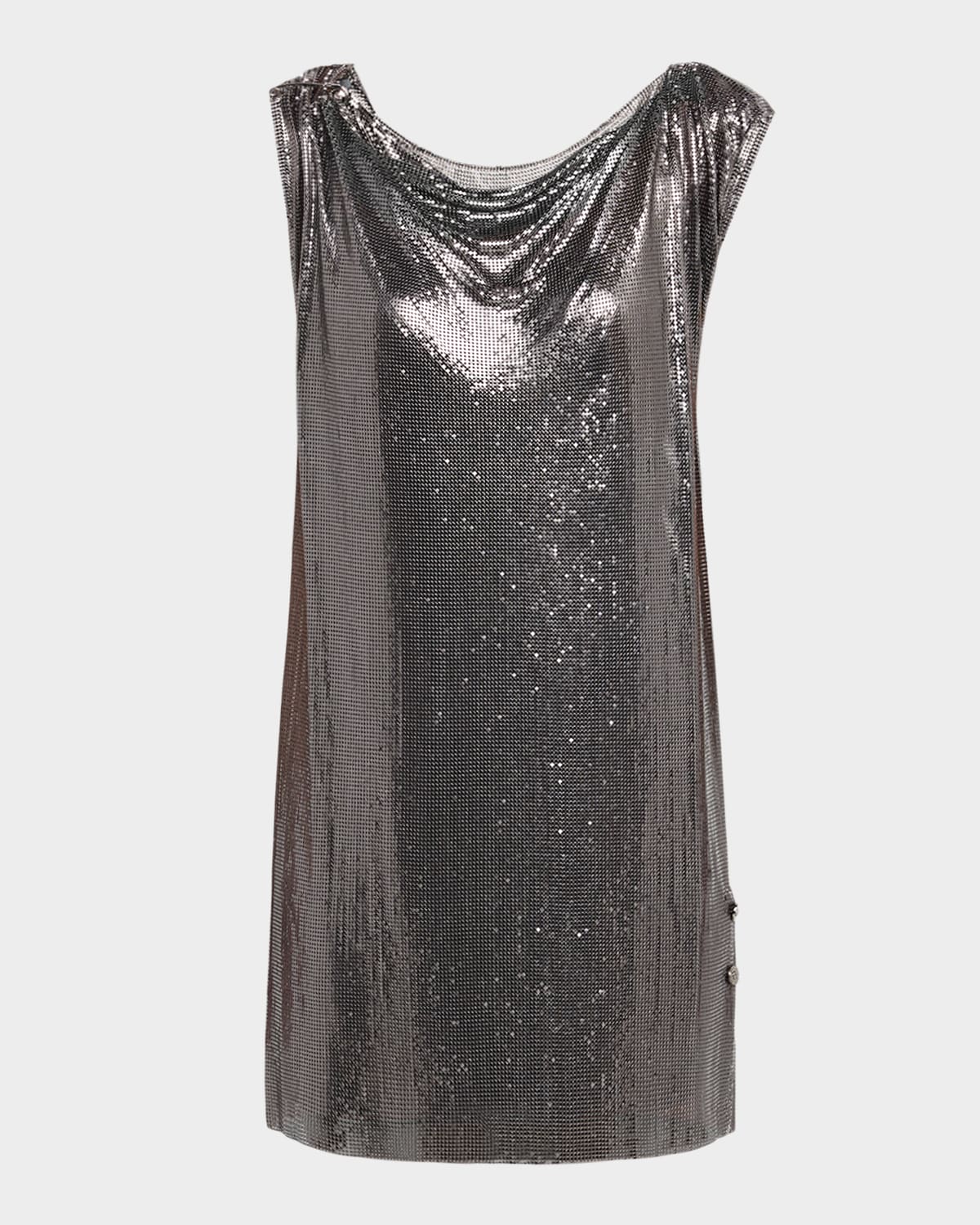 Crafted from Versace's Atelier metal mesh, this mini dress features a signature saftety pin detail and Medusa hardware for a statement silhouette that shines with every movement. Draped neckline Sleeveless Shift silhouette Hem falls above the knee Side zip and snap closure Metal Lining: Acetate/silk Dry clean Made in Italy