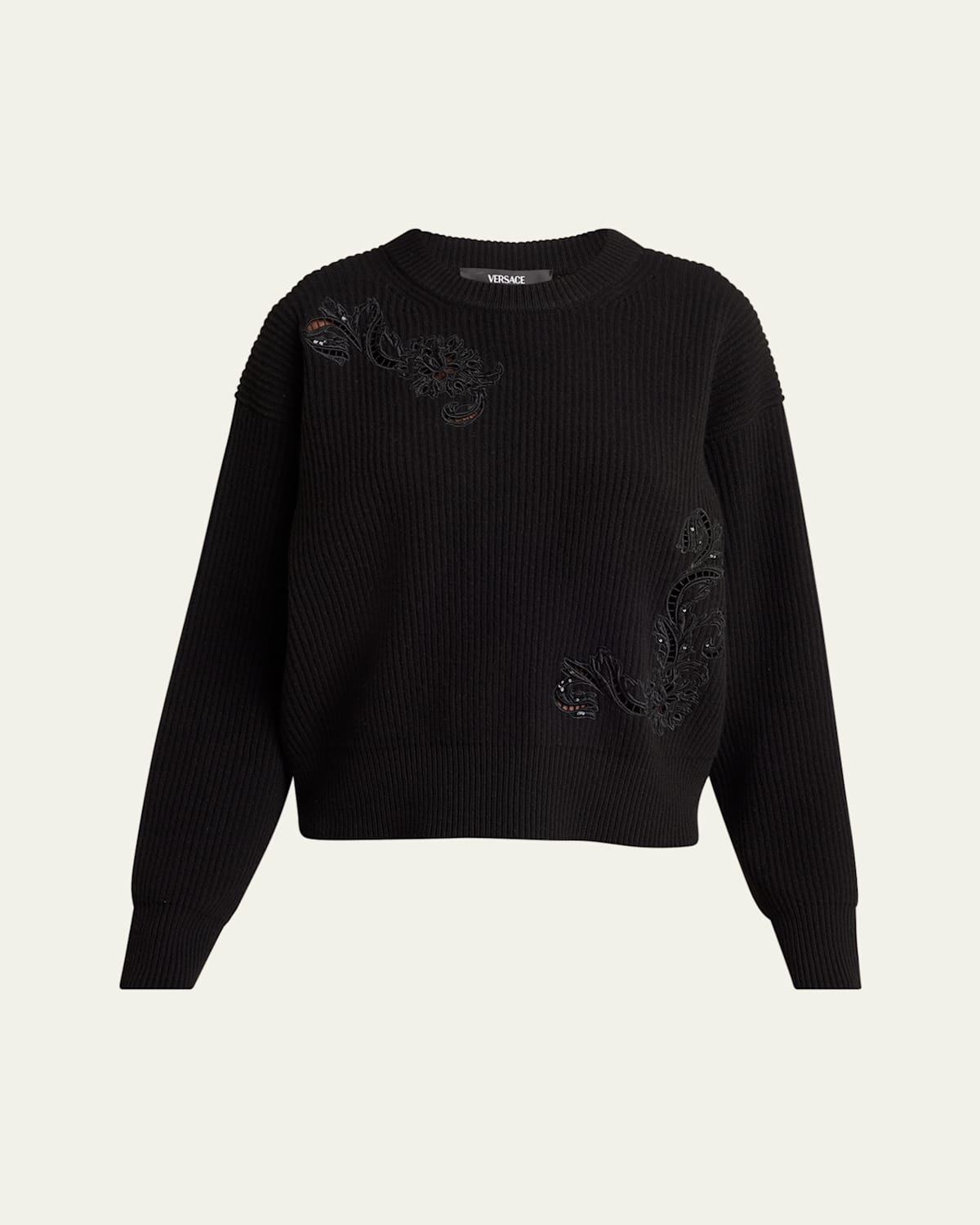 Versace ribbed knit sweater enhanced with Barocco leaf embroidery and sequin embellishment Crew neckline Long sleeves Relaxed fit Pullover style Virgin wool/polyester Dry clean Made in Italy