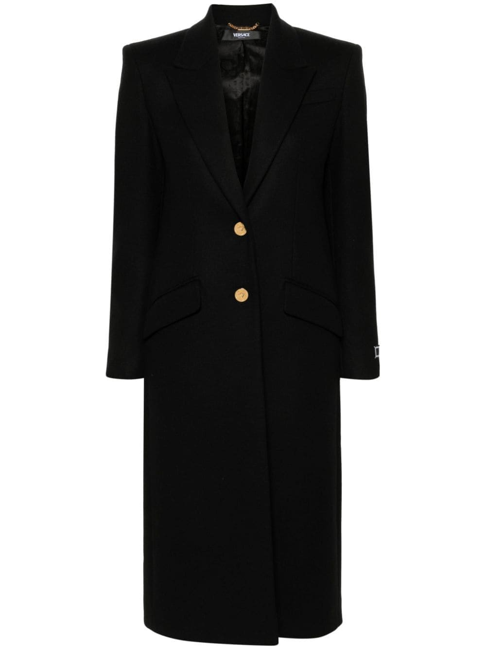 black virgin wool blend signature Medusa Head buttons logo patch at the sleeve peak lapels front button fastening shoulder pads long sleeves buttoned cuffs chest welt pocket two front flap pockets central rear vent straight hem mid-length