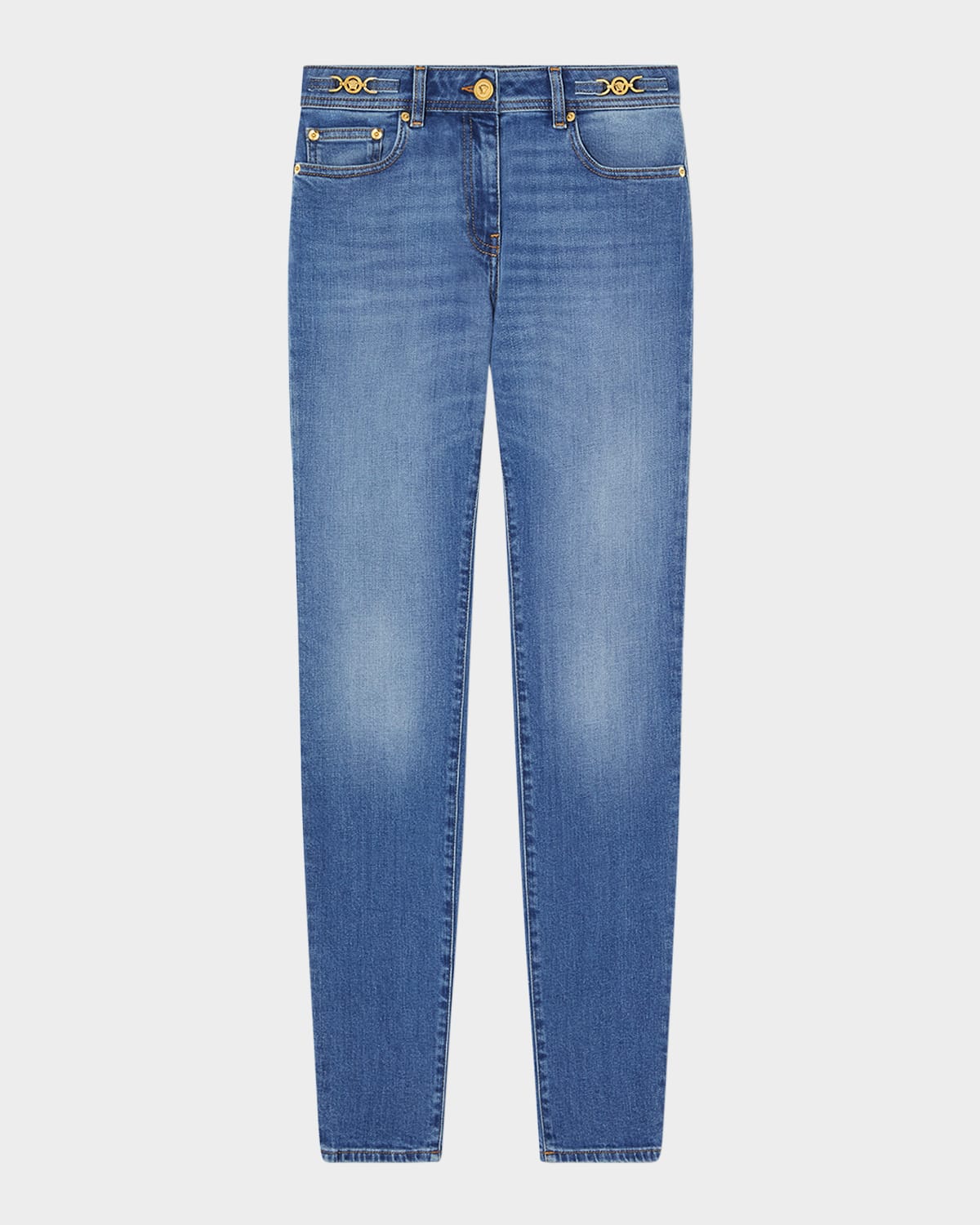 Versace pants in stretch denim stone washed with a special compound Features goldtone signature Medusa hip details Mid rise sits high on hip Fivepocket style Skinny legs Full length Button/zip fly; belt loops Cotton/elastane/leather Dry clean Made in Italy