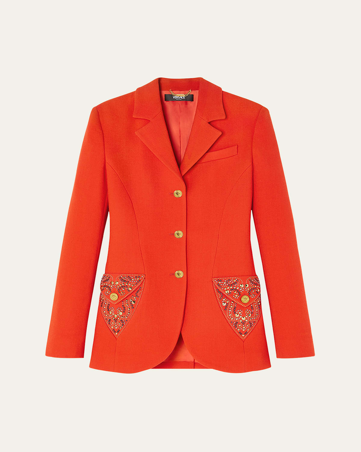 This Versace jacket is cut from lightweight doublewool crepe, decorated with signature Medusa buttons and intricate stud detailing Notched lapels Singlebreasted front Long sleeves Button cuffs Chest welt pocket Princess seams Buttoned flap pockets Rounded front hem Center back slit Tailored fit Virgin wool Dry clean Made in Italy