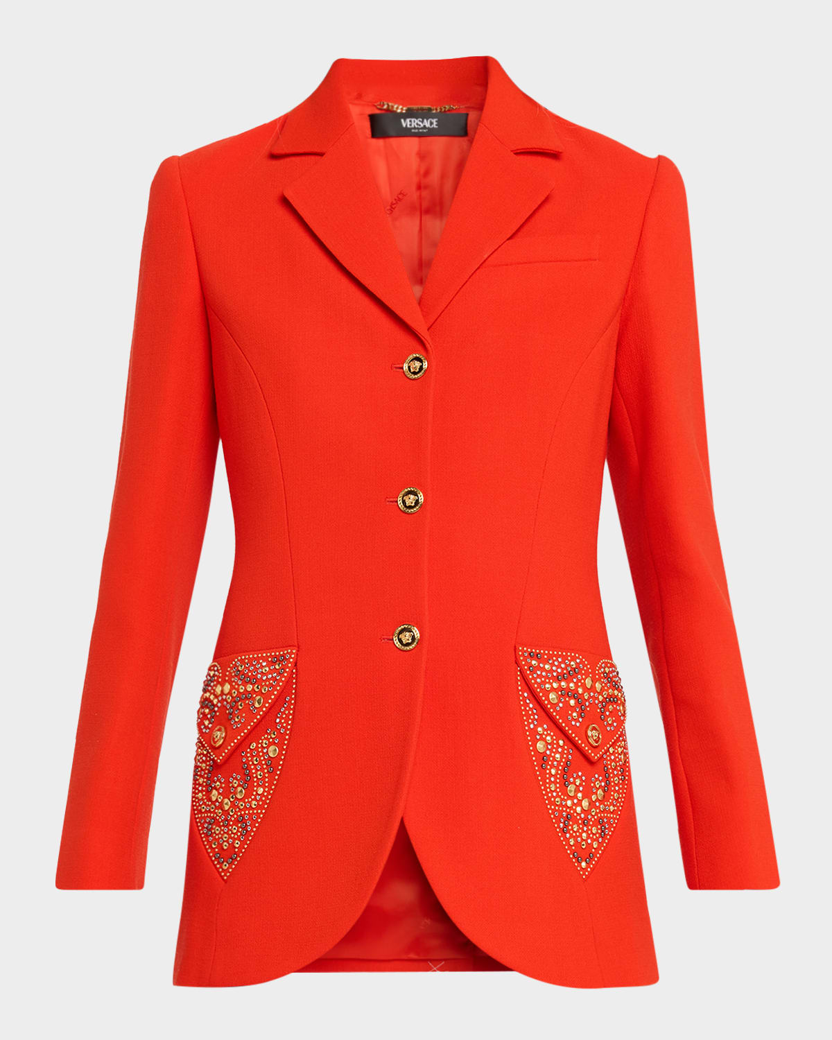This Versace jacket is cut from lightweight doublewool crepe, decorated with signature Medusa buttons and intricate stud detailing Notched lapels Singlebreasted front Long sleeves Button cuffs Chest welt pocket Princess seams Buttoned flap pockets Rounded front hem Center back slit Tailored fit Virgin wool Dry clean Made in Italy