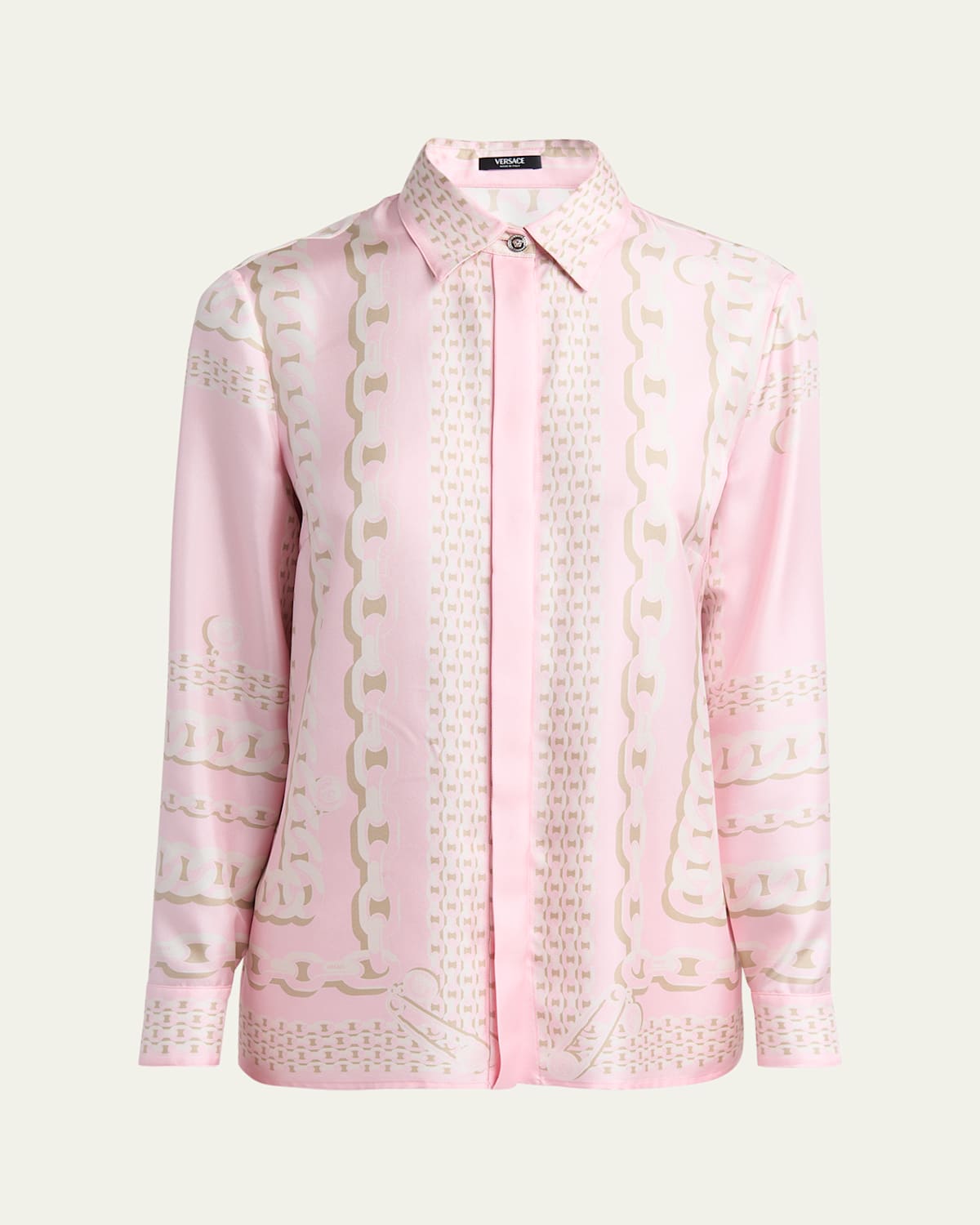 Versace silk twill formal shirt featuring Versace Treasure foulard print and silvertone signature Medusa buttons Point collar; concealed button front Long sleeves; button cuffs Loose fit Silk/motherofpearl buttons Professional cleaning recommended Made in Italy