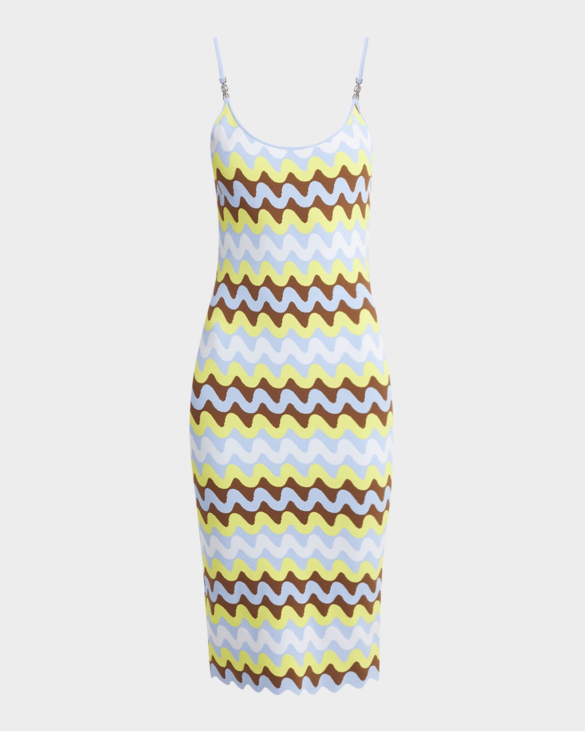 Versace compact stretch viscose knit dress featuring a wavy intarsia, signature Medusa strap details, and a scalloped hem Scoop neckline Sleeveless Bodyconscious silhouette Hem falls below the knee Slipover style Viscose/nylon/polyamide/polyester Dry clean Made in Italy
