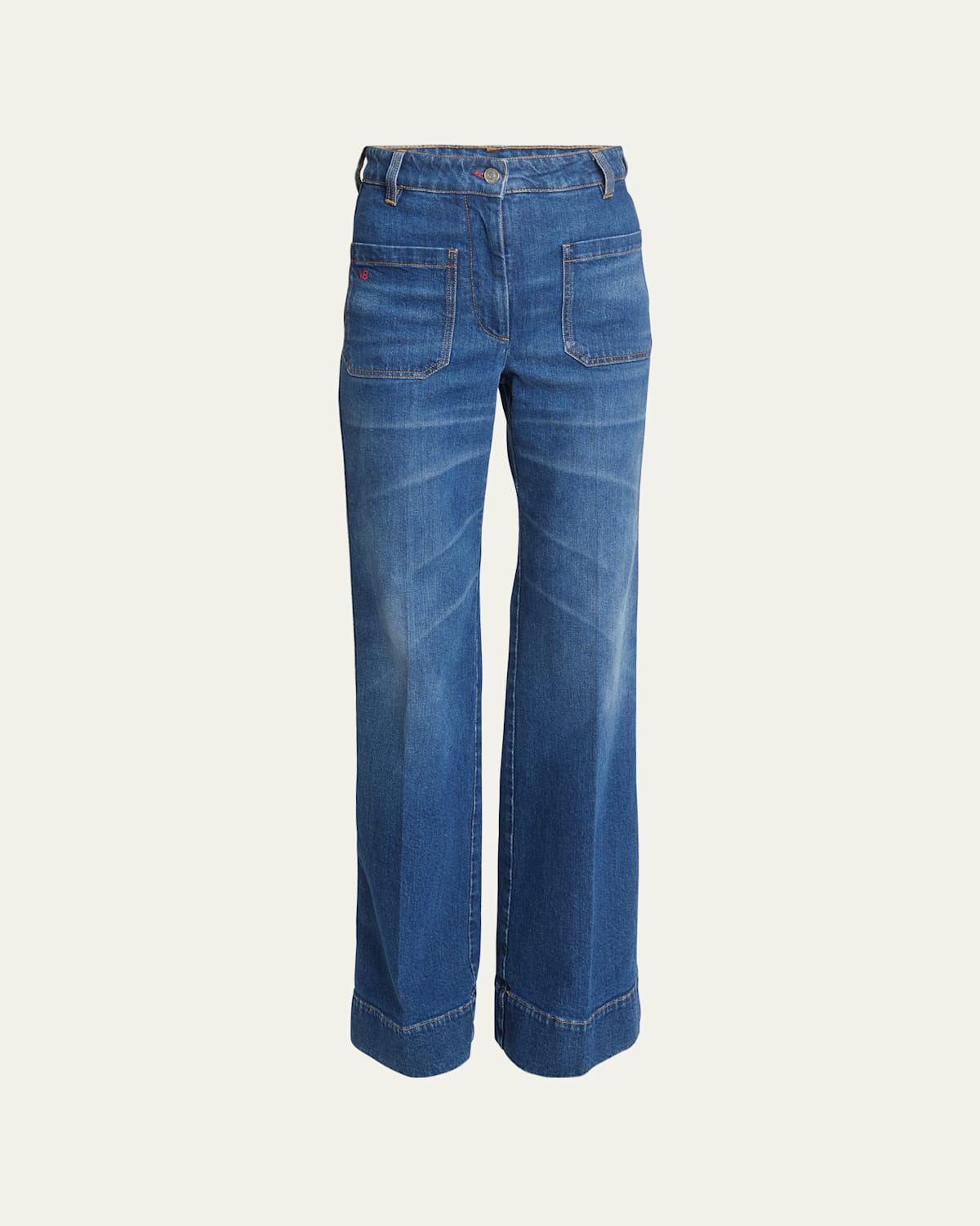 Victoria Beckham "Alina" jeans with embroidered monogram on pocket High rise Front patch pockets; back patch pockets Flare legs Full length Button/zip fly; belt loops Cotton/elastane Machine wash cold Made in Italy