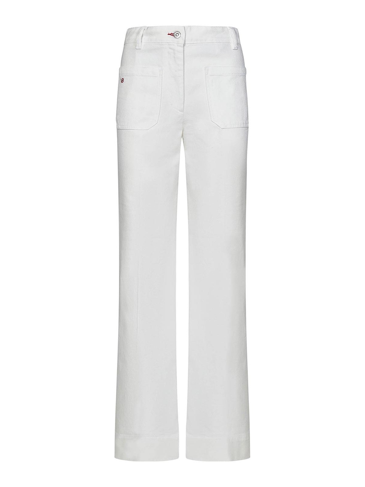 Bouton et fermeture éclair cachée, taille haute avec passants de ceinture, poches plaquées sur et au dos, logo VB rouge sur la poche droite, jambes évasées, étiquette marron cousue au dos, couleur blanche