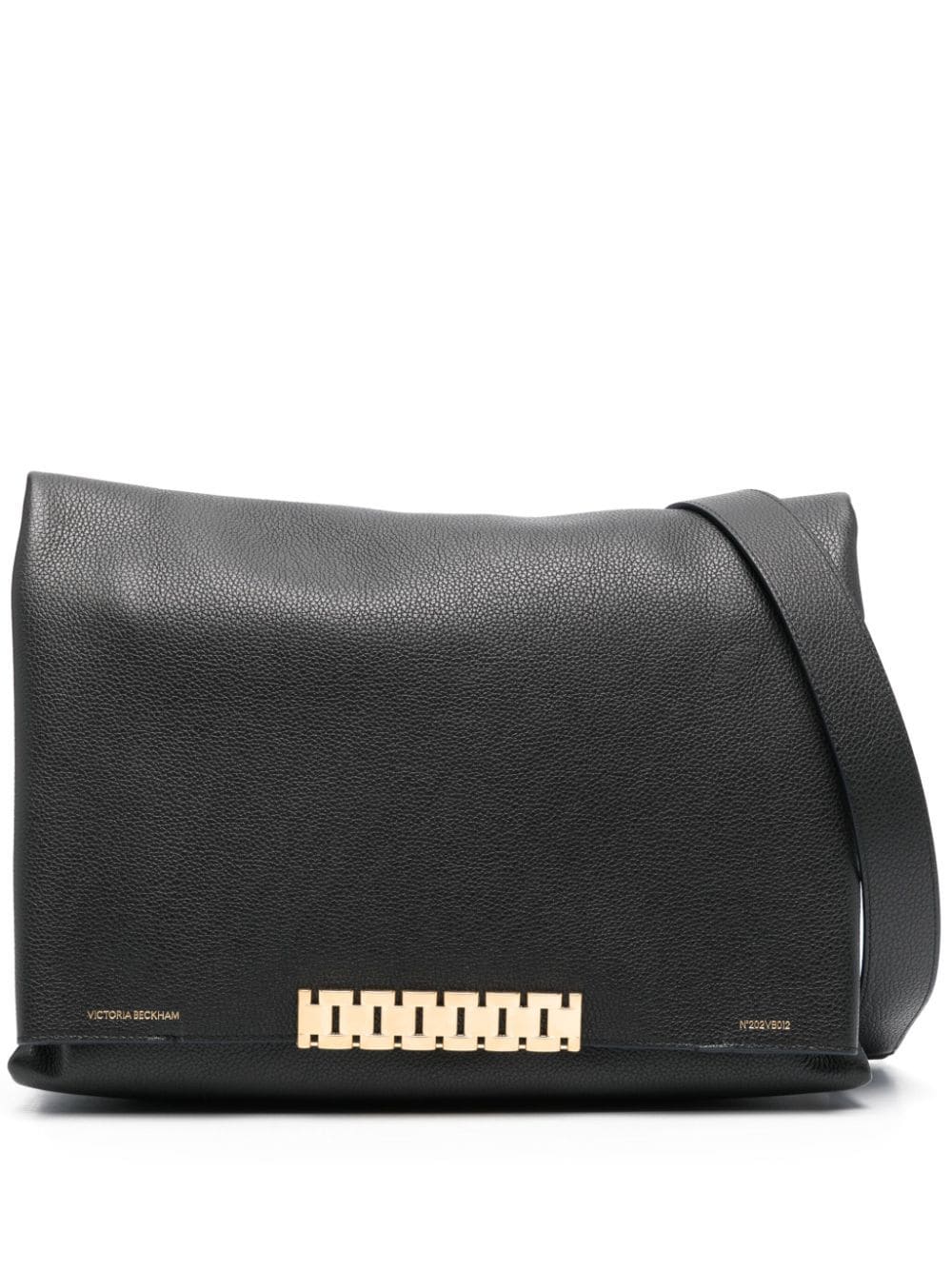 black calf leather pebbled texture logo stamp to the front chain-link trim foldover top adjustable detachable shoulder strap partitioned compartment internal press-stud slip pocket internal logo tag contrast lining gold-tone hardware concealed magnetic fastening This piece comes complete with a protective dust bag.