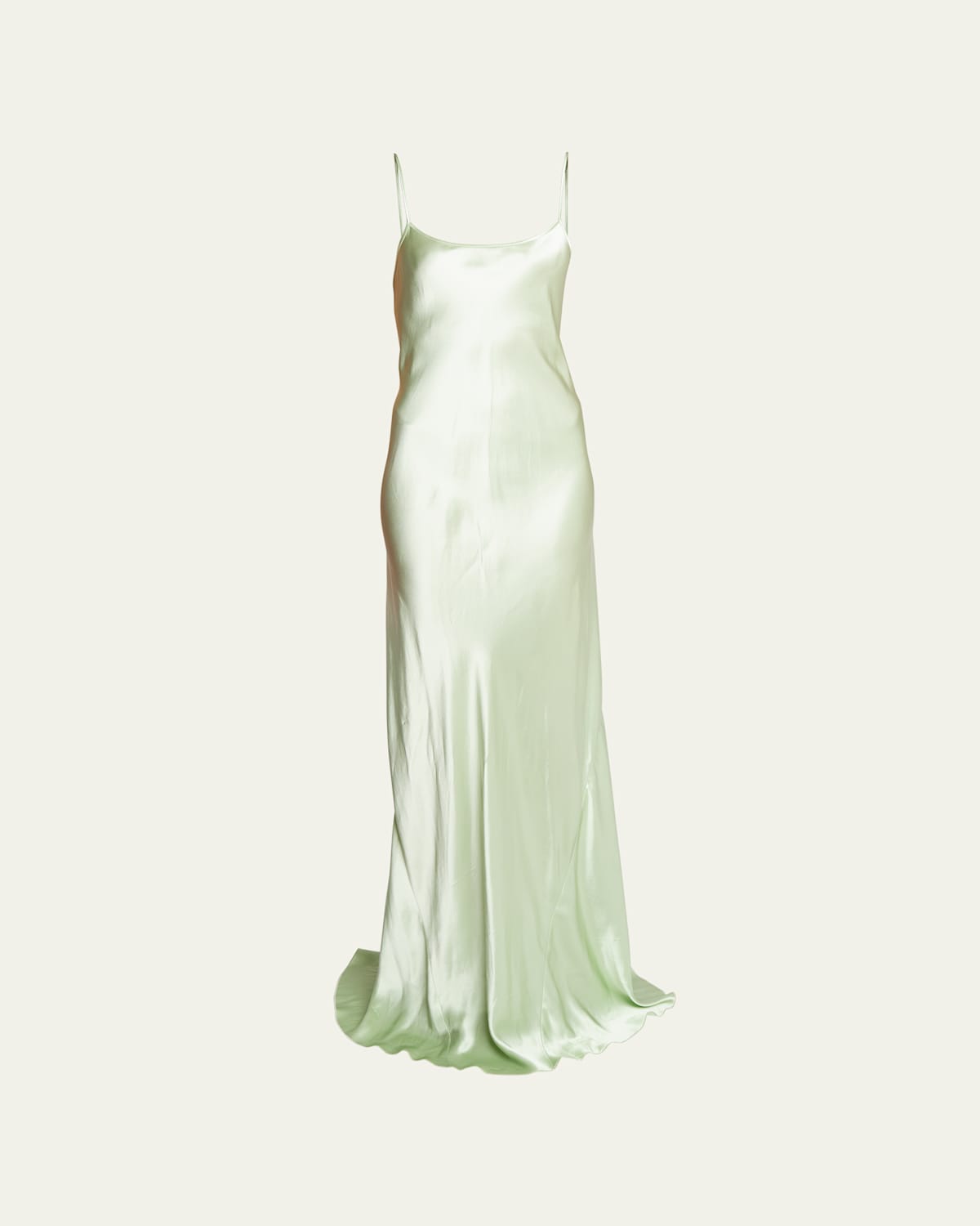 Victoria Beckham satin cami dress Scoop neckline; open back Spaghetti straps Aline silhouette Hem pools floor Polyester Dry clean Made in United Kingdom