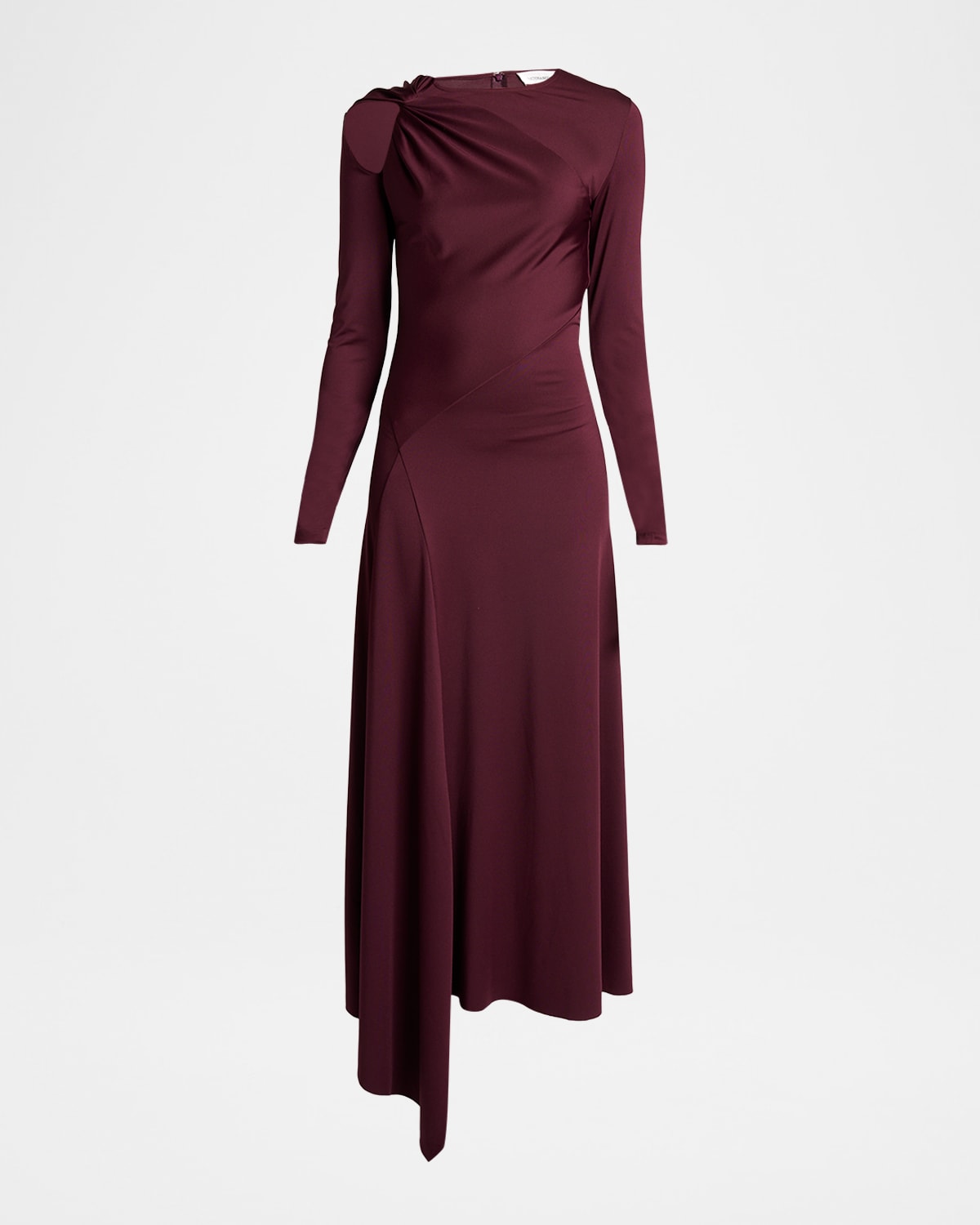 Victoria Beckham dress featuring a twisted cold shoulder detail and an asymmetric hem Round neckline Long sleeves Aline silhouette Ankle length Back zip Polyester/elastane Dry clean Made in Portugal