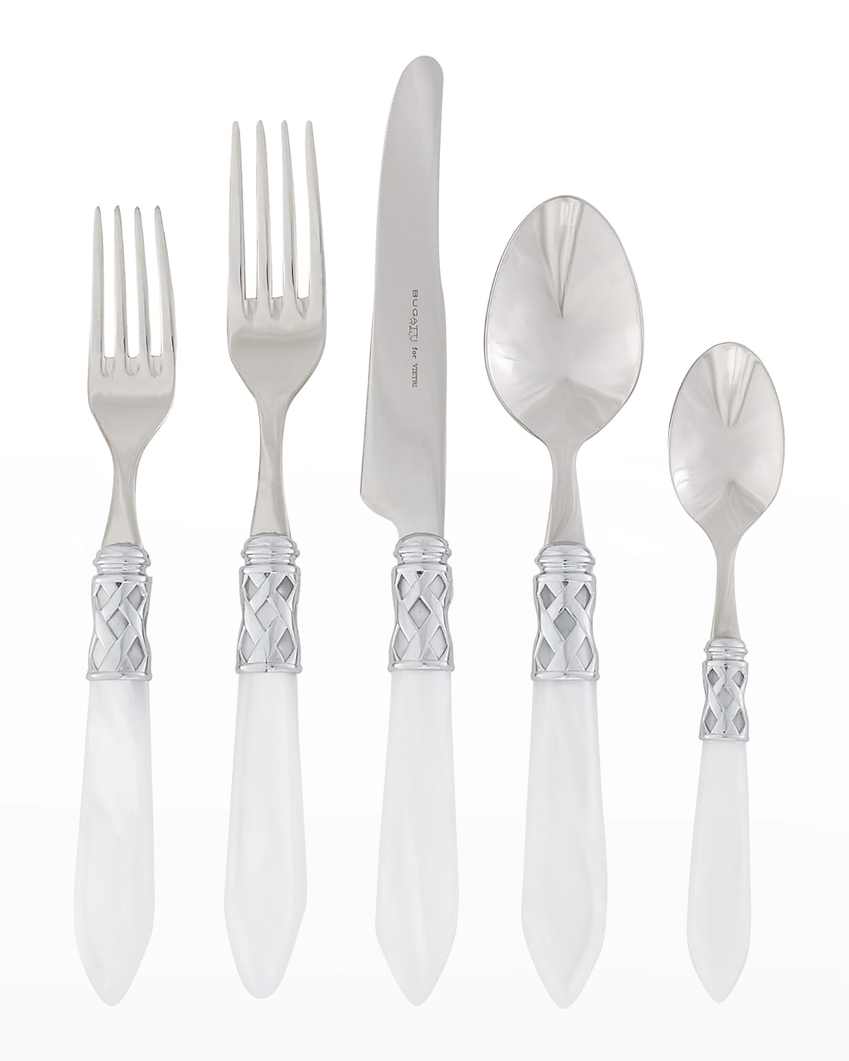 Handcrafted set of five place setting set features elegant pearlized handles. Includes salad/dessert fork, dinner fork, dinner knife, tablespoon, and teaspoon. Made of 18/10 stainless steel. Approx. 6.259.5"L. Dishwasher safe. Made in Italy.