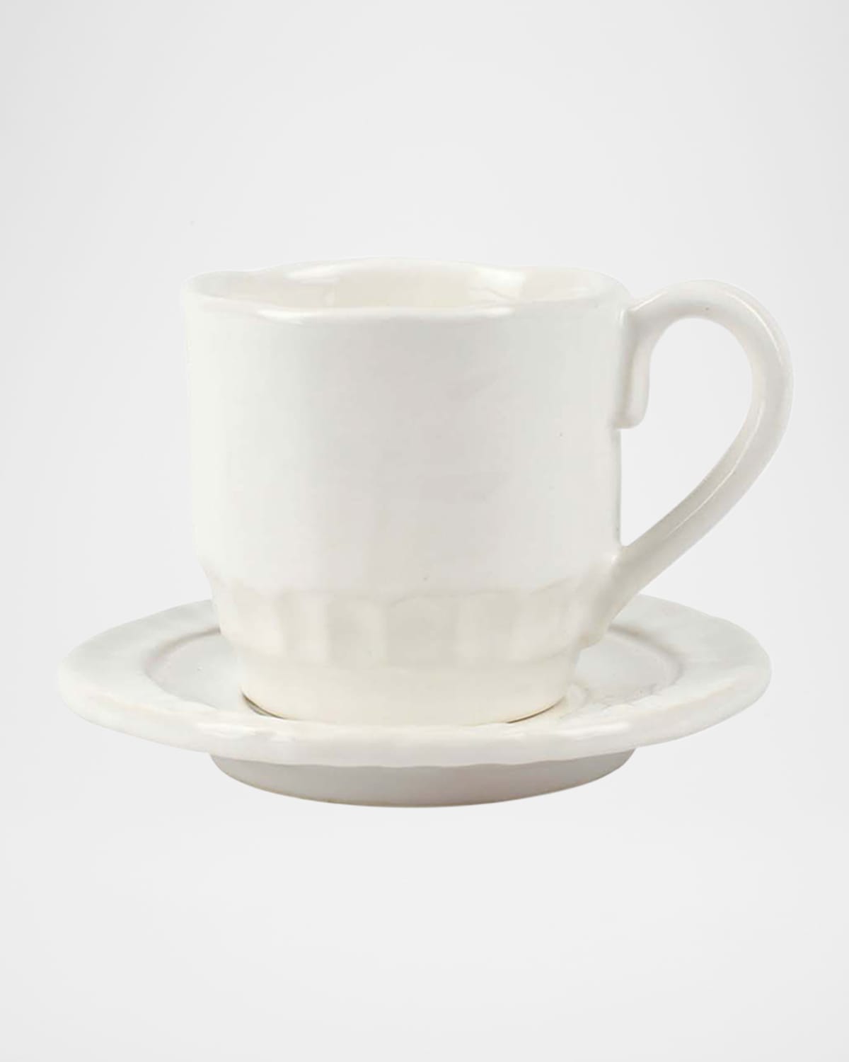 Characterized by handpressed edges, Pietra Serena pays tribute to the architectural details of Florence, Italy during the Renaissance. The Pietra Serena Espresso Cup amp; Saucer features a handpressed design and is a simply beautiful duo. Handcrafted of Italian stoneware Cup, approx. 2.75"T; 4 oz. capacity Saucer, 4.75"Dia. Item Weight (Lbs.): 3.4 Microwave, oven, and freezer safe Dishwasher safe Made in Italy