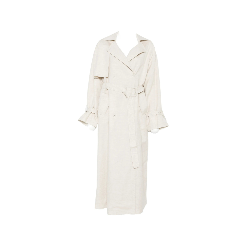 beige double-breasted button fastening side flap pockets belted long sleeves This piece comes complete with a protective dust bag.