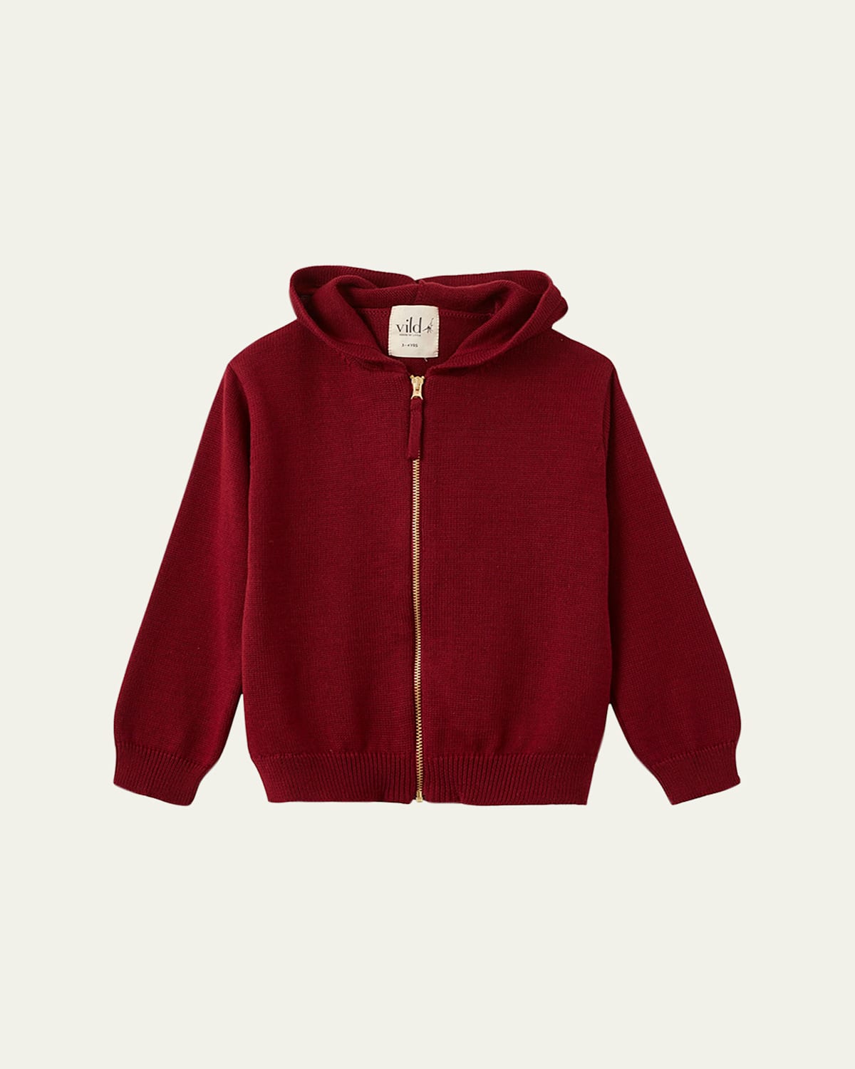Vild House of Little zipup knit cardigan Hooded collar Long sleeves Ribbed cuffs and hem Organic cotton Unlined Made in Portugal