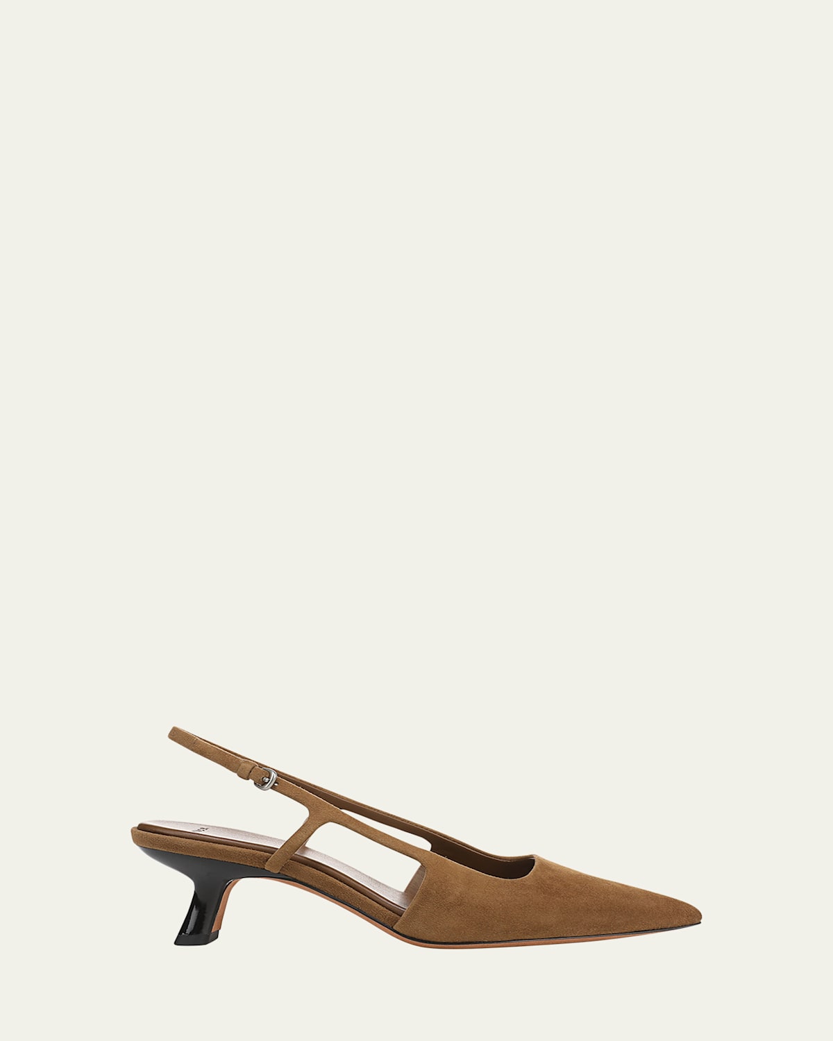 Vince "Bianca" pumps rendered in buttery suede and set on a walkable low heel formed in a modern, sculptural shape 2.00 in / 50 mm kitten heel Pointed toe Anchored, adjustable slingback Leather outsole Lining: Leather Spot clean Imported
