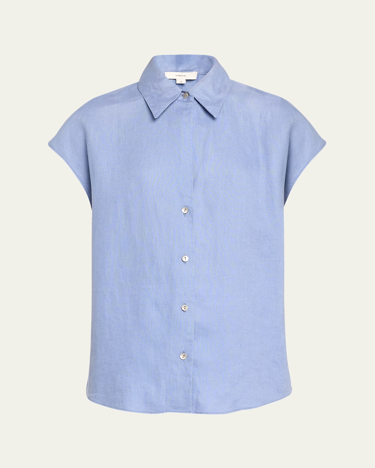 Vince crisp blouse with motherofpearl buttons Spread collar; button placket Cap sleeves Yoked back Straight fit Curved hem Linen Imported