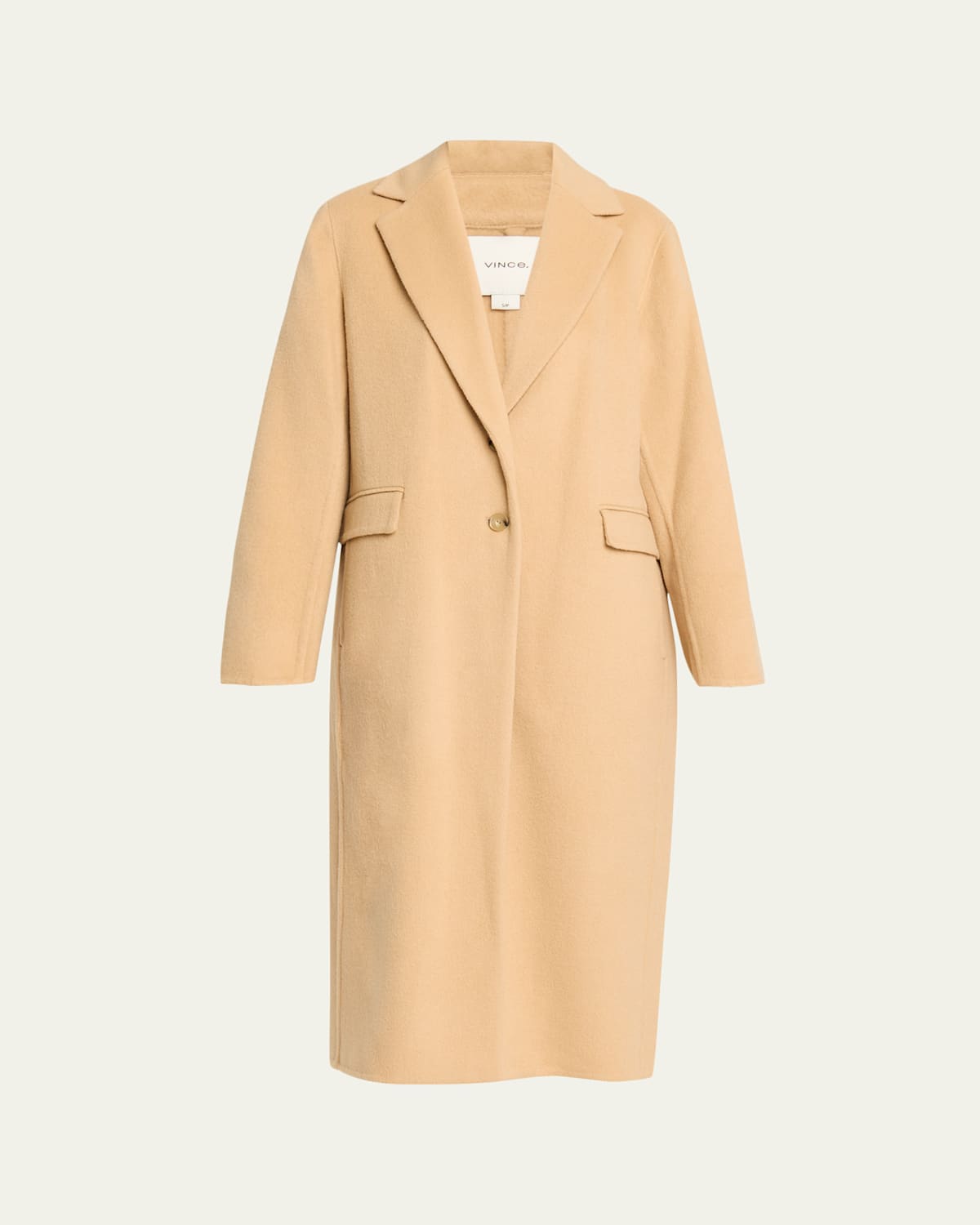 Luxurious cashmere and wool blend coat by Vince. Notch lapels Singlebreasted front Long sleeves Side seam pockets; flap pockets Relaxed fit Walking vent Buttonfront Wool/cashmere Hand wash or dry clean Imported