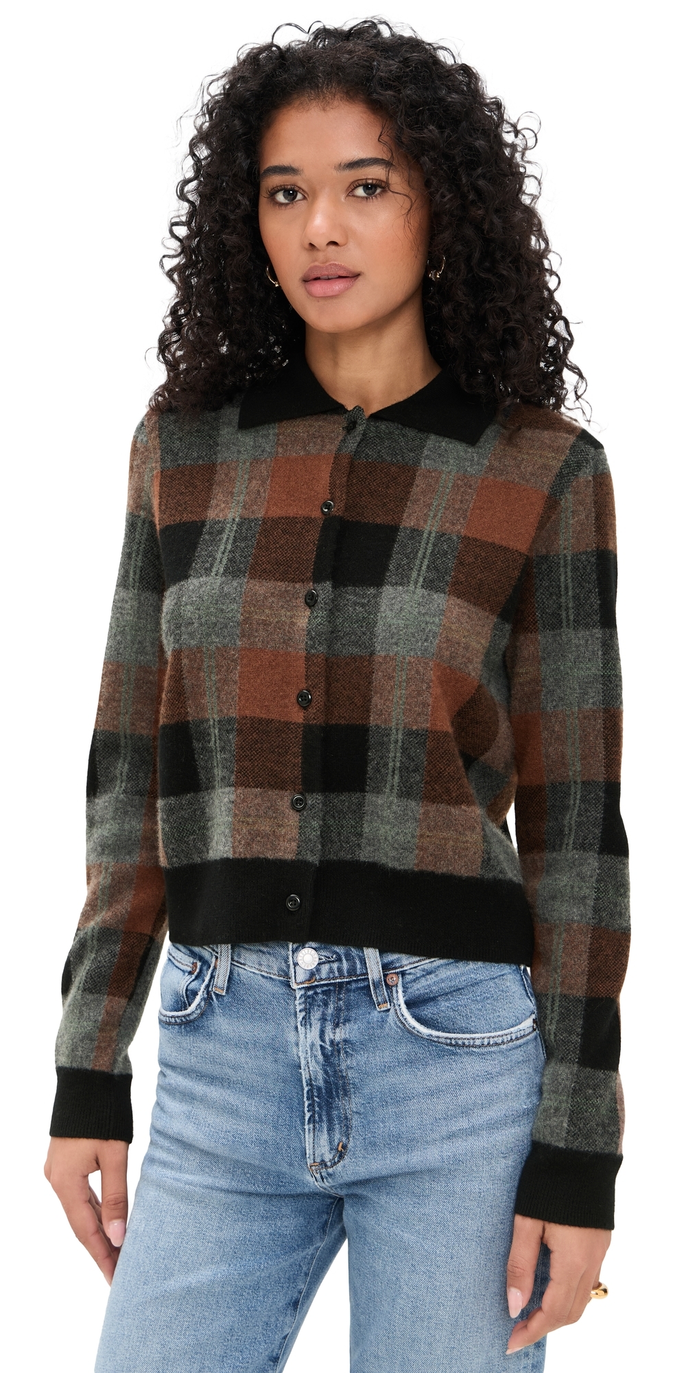 Check Plaid Cashmere Polo Cardigan Cacao/Dk H Pewter/Black Combo