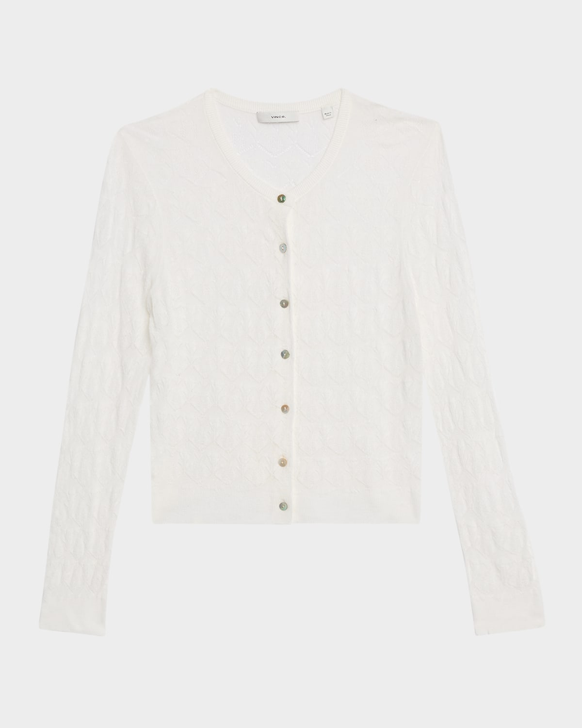 Vince delicate lace stitched cardigan Crew neckline Long sleeves Classic fit Hem sits at the hip Buttonfront Cotton Hand wash cold or dry clean Imported