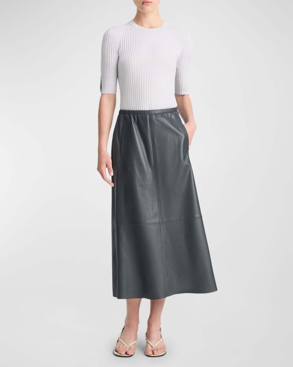 Vince paneled skirt crafted from lambskin leather Mid rise Hem falls below the knee Aline silhouette Hidden back zip closure Leather method dry cleaning Imported