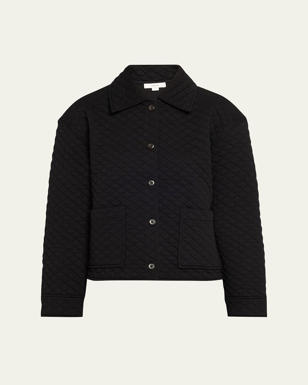 Vince's quilted jacket features a point collar and is cut in a boxy dropshoulder silhouette. Point collar Long sleeves Side patch pockets Relaxed fit Buttonfront Cotton/polyester/spandex Hand wash Imported
