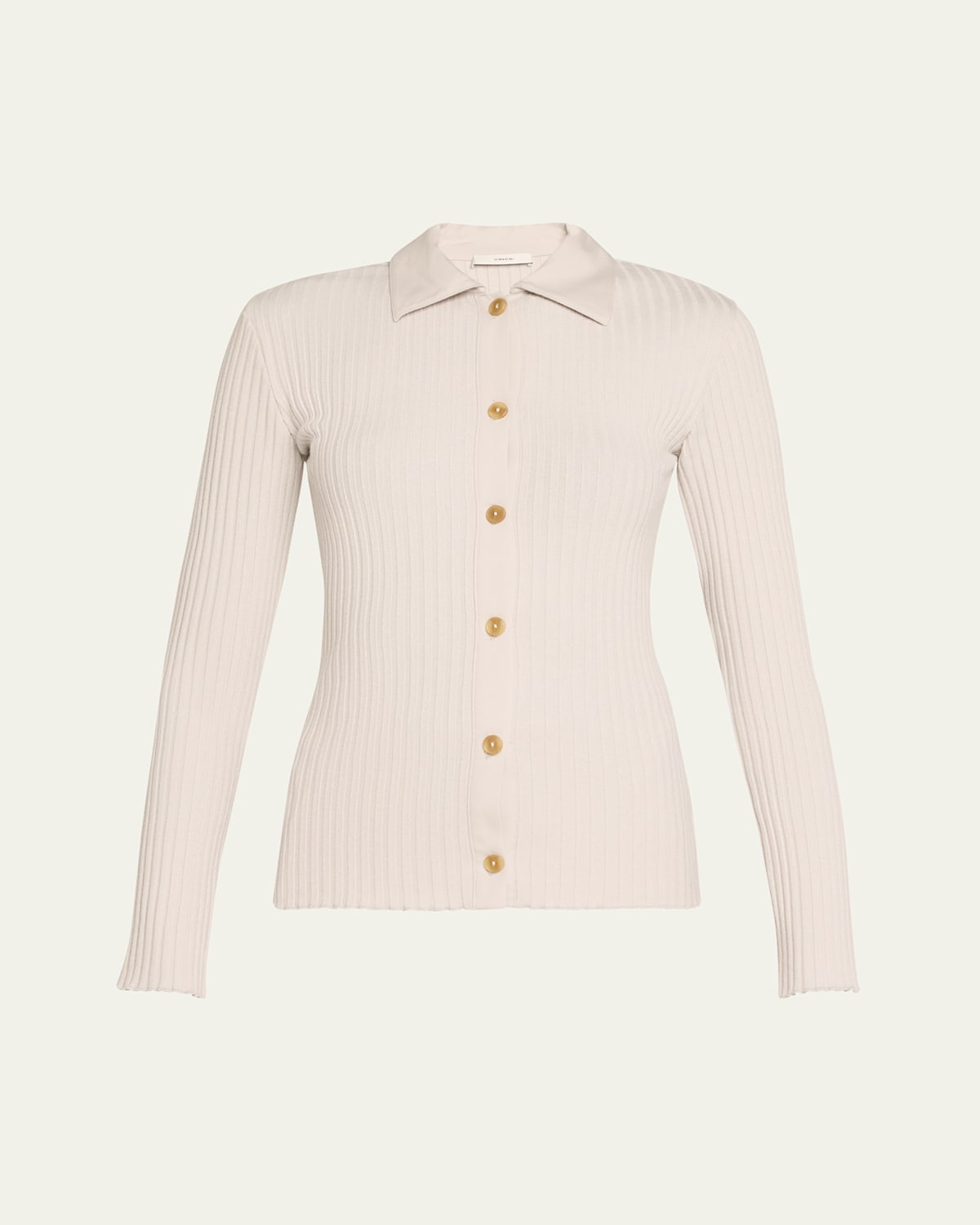 Vince ribbed polo shirt with tort buttons Spread collar; button placket Long sleeves Hip length Slim fit Cotton/polyester/spandex Imported