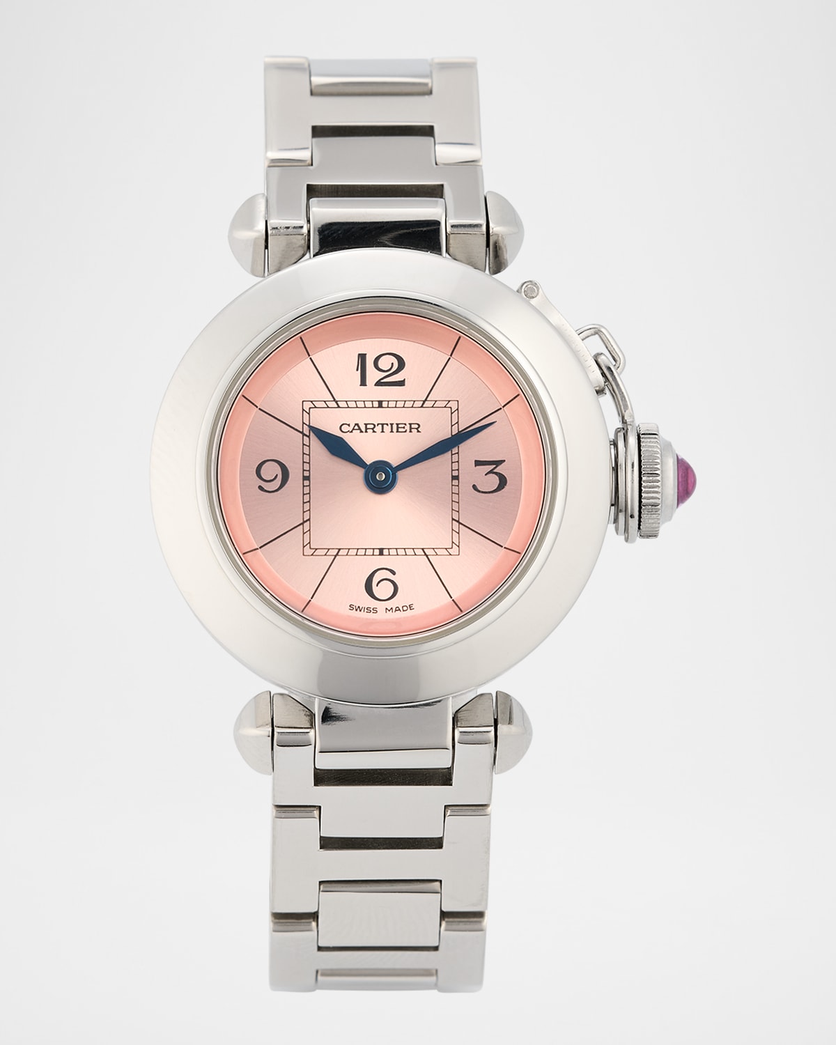 Miss Pasha watch by Cartier Approx. 27mm round screwdown case Stainless steel case and bracelet Ice pink dial with Arabic markers at 12369 and line markers Feuilles Fortes hands Sapphire crystal window Twohand quartz movement Reference #W3140008 / 2973 Circa 2010s Each Vintage Watch purchase includes a Neiman Marcus watch box and Neiman Marcus certificate of authenticity. Original box and papers are not offered in most instances, and will be noted on the site when they are. Made in Switzerland