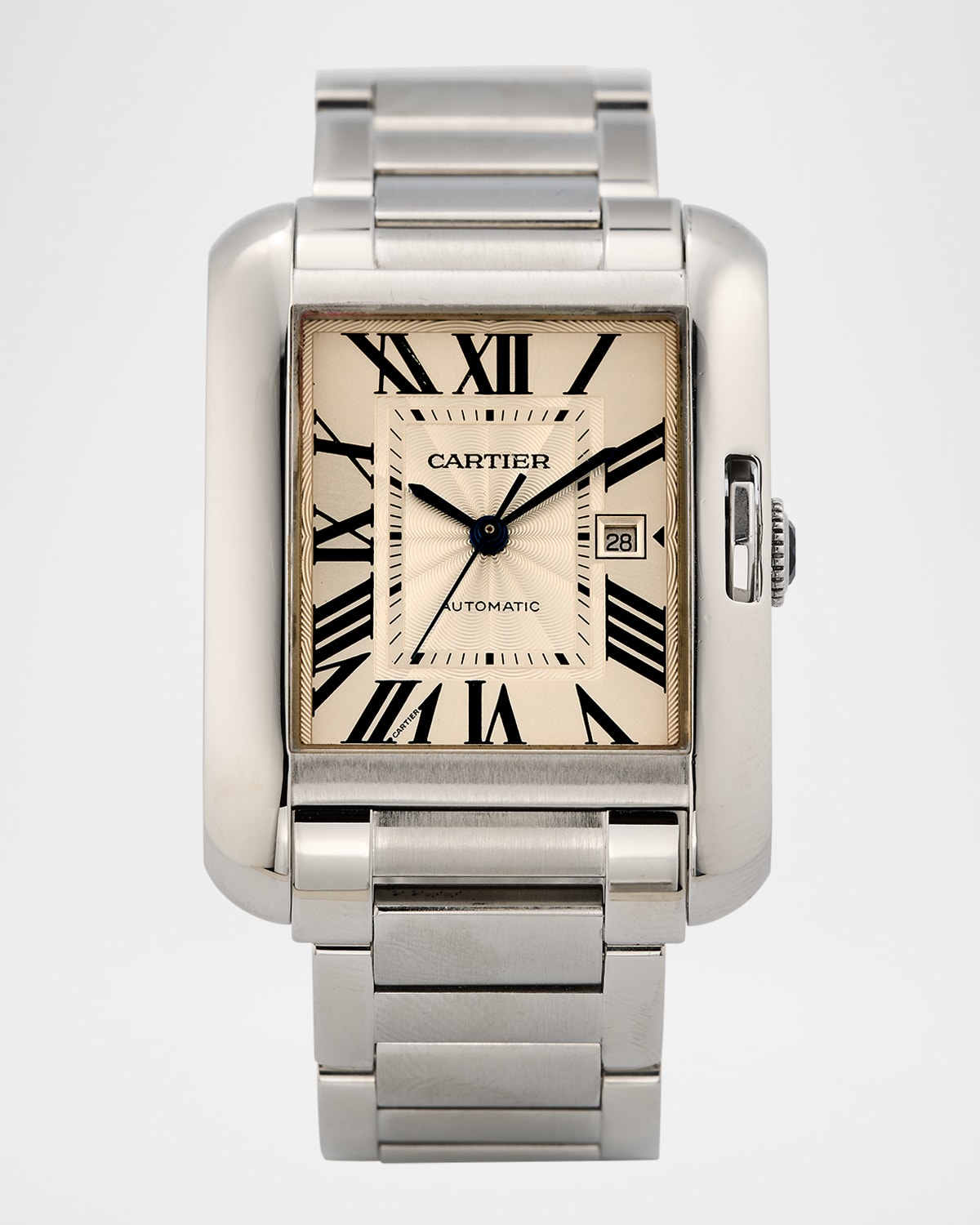 Tank Anglaise watch by Cartier Approx. 39mm rectangle screwdown case Stainless steel case and bracelet Silver dial with guilloche center Roman explosion markers Sword hands and sweep seconds Date window at 3 o'clock Sapphire crystal window Stainless steel Cartier link bracelet and doublefolding clasp Reference #3511 Circa 2010s Each Vintage Watch purchase includes a Neiman Marcus watch box and Neiman Marcus certificate of authenticity. Original box and papers are not offered in most instances, and will be noted on the site when they are. Made in Switzerland