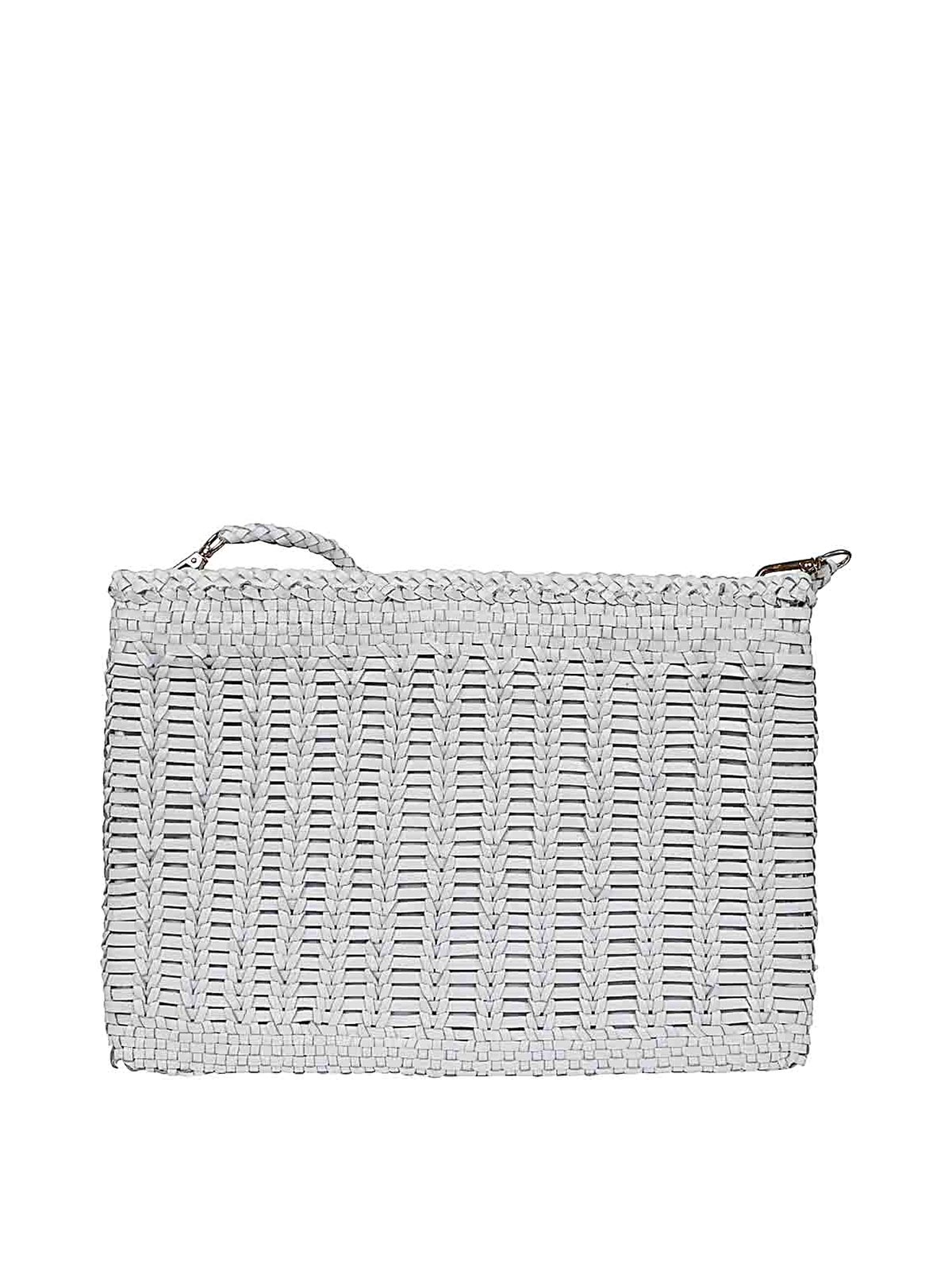 Couleur jaune, motif tissé, compartiment unique, poche intérieure, fermeture zippée, bandoulière en cuir amovible.
