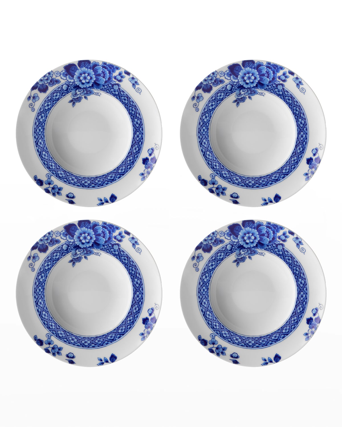 Set of four porcelain soup plates. Each, approx. 10"L x 1.8"W. 9.7oz capacity. Microwave/dishwasher safe. Made in Portugal.