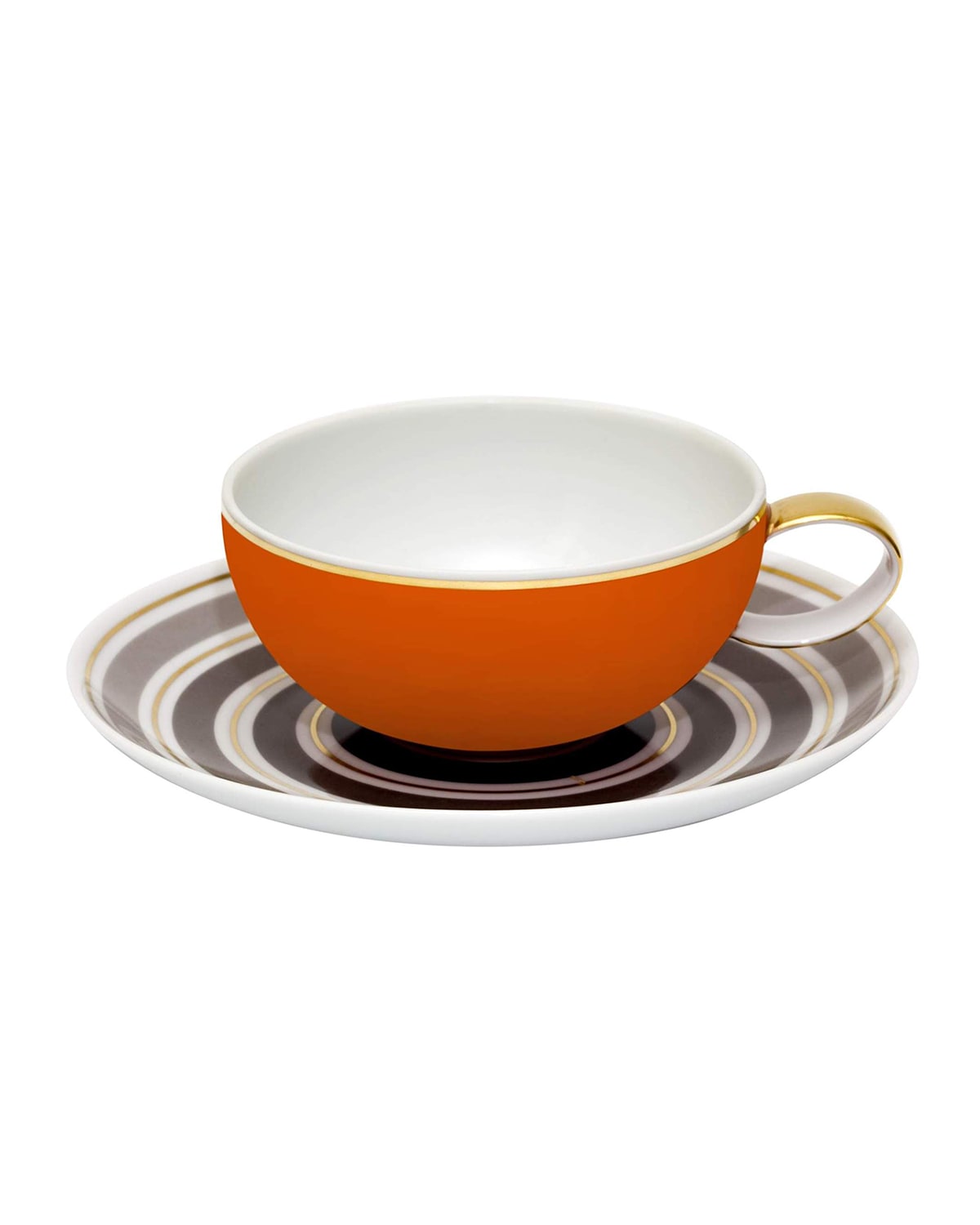 Porcelain tea cup and saucer. Enhanced with golden accents. Holds 8.5 ounces. 6.6"W x 2"T. Not suitable for microwaves. Dishwasher cold and short cycle only. Made in Portugal.