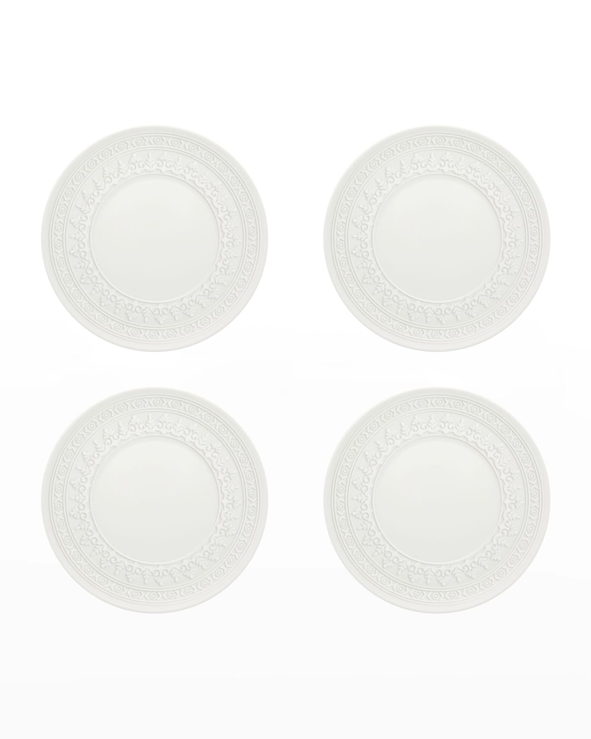 Set of four bread and butter plates. Made of porcelain. Each: 6.65"Dia. x 0.67"T. Microwave and dishwasher safe. Made in Portugal.