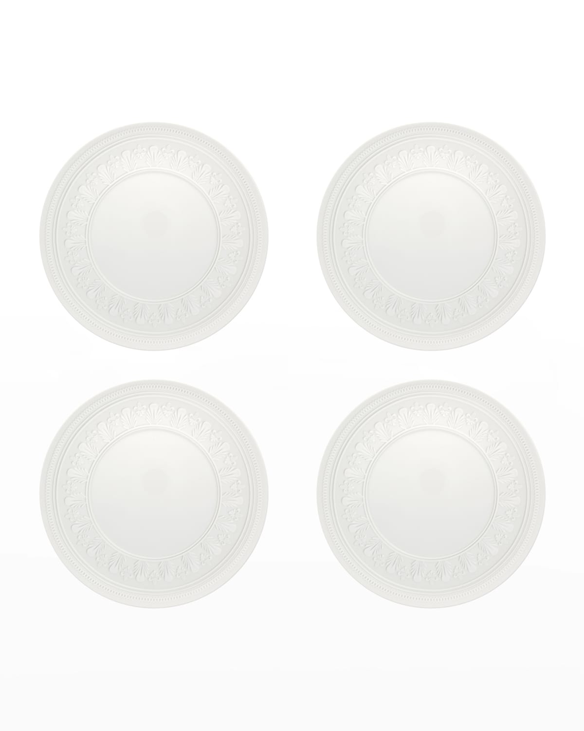 Set of four porcelain dessert/salad plates. Approx. 9"Dia. x 0.9"T. Microwave and dishwasher safe. Made in Portugal.
